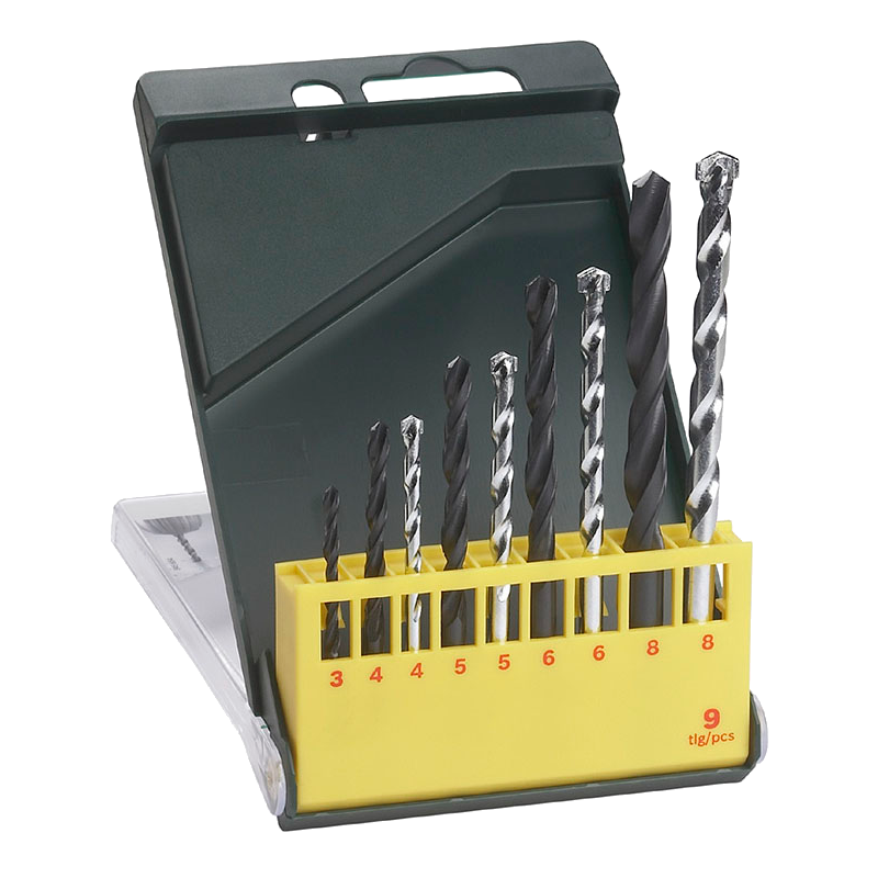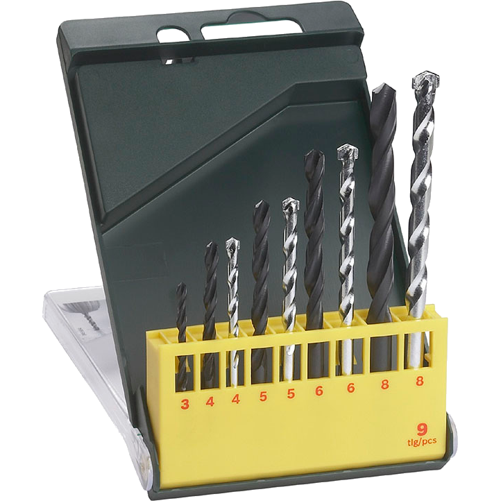 9 darabos fém- és kőfúró készlet. 5db HSS-R fémfúró 3-8mm, 4db HM kőzetfúró 4-8mm, műanyag kazetta, súly: 0,18kg.