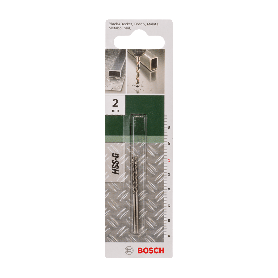 Bosch fémfúrószár. Professzionális fúrószár minden alkalmazáshoz. Használható fém, színesfém és műanyag fúrásához. Ütésmentes futás és pontosság jellemzi. Tömör gyorsacélból köszörült, erős spirálfúró, jobbra vágó éllel. A fúrószár csúcsszöge 118°. Hengeres befogószárú. Bármilyen gyártmányú szerszámgéppel használható. Átmérő: 2 mm. Szárátmérő: 2 mm. Munkahossz: 24 mm. Teljes hossz: 49 mm.