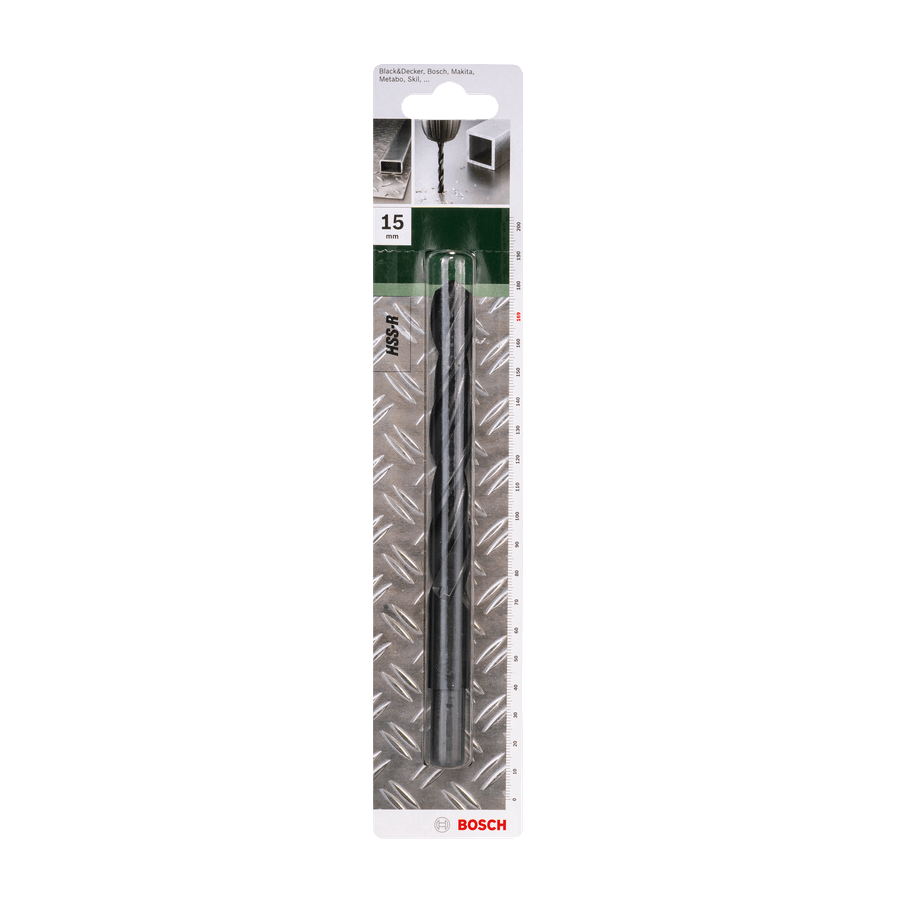 Bosch fémfúrószárak. Minőségi fúrószár alkalmankénti használatra. Használható fém, színesfém és műanyag fúrásához. Gyorsacélból készült, erős spirálfúró, jobbra vágó éllel. A fúrószár csúcsszöge 118°. Hengeres befogószárral. Bármilyen gyártmányú szerszámgéppel használható. Átmérő: 15 mm. Szárátmérő: 12 mm. Munkahossz: 114 mm. Teljes hossz: 169 mm.
