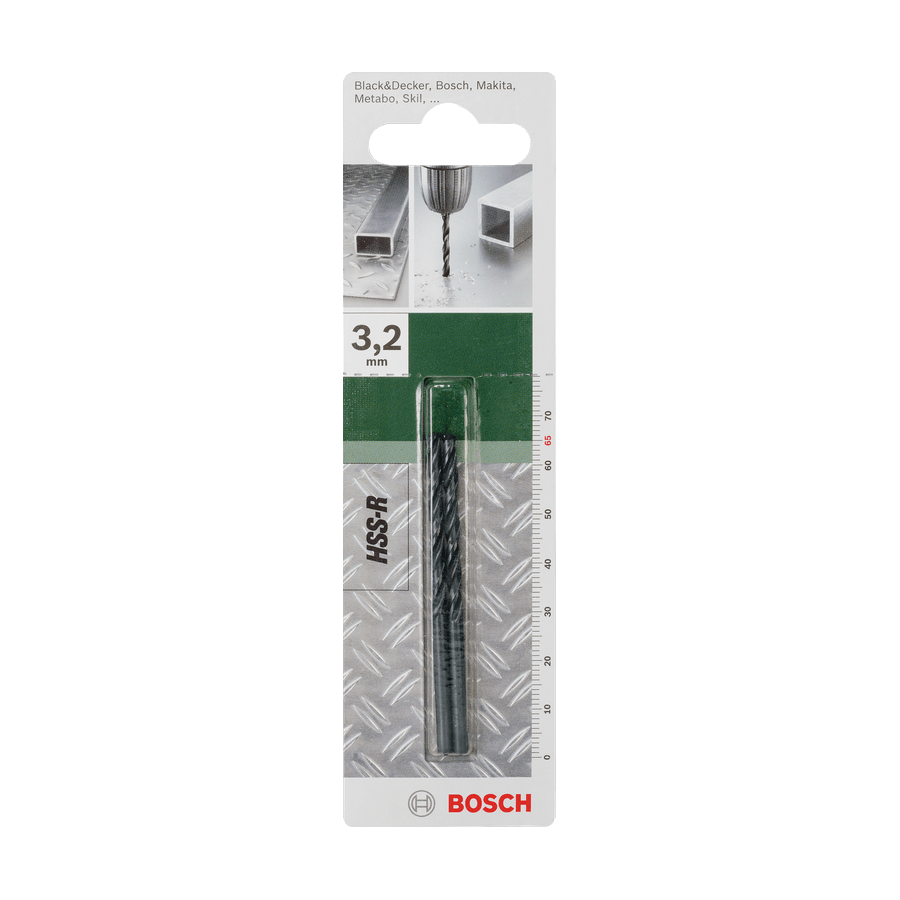Bosch fémfúrószárak. Minőségi fúrószár alkalmankénti használatra. Használható fém, színesfém és műanyag fúrásához. Gyorsacélból készült, erős spirálfúró, jobbra vágó éllel. A fúrószár csúcsszöge 118°. Hengeres befogószárral. Bármilyen gyártmányú szerszámgéppel használható. Átmérő: 3.2 mm. Szárátmérő: 3.2 mm. Munkahossz: 36 mm. Teljes hossz: 65 mm.