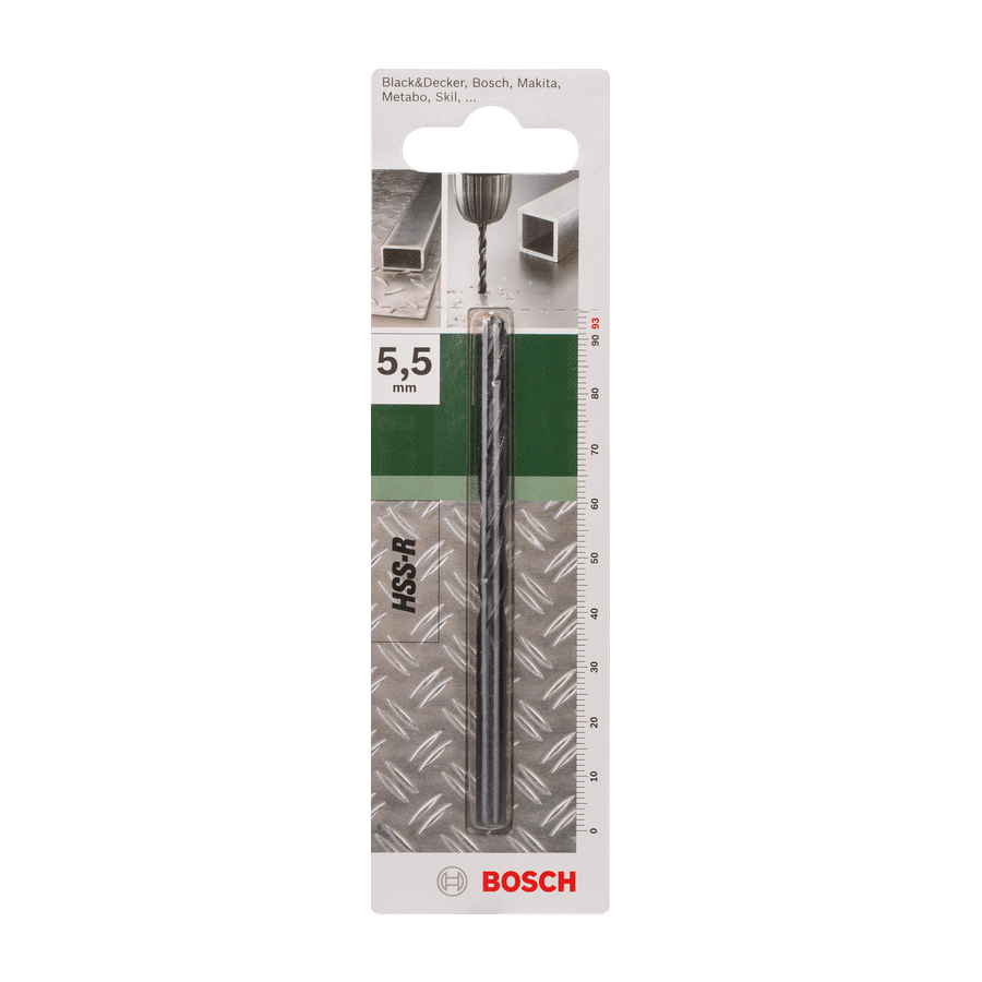 Bosch fémfúrószárak. Minőségi fúrószár alkalmankénti használatra. Használható fém, színesfém és műanyag fúrásához. Gyorsacélból készült, erős spirálfúró, jobbra vágó éllel. A fúrószár csúcsszöge 118°. Hengeres befogószárral. Bármilyen gyártmányú szerszámgéppel használható. Átmérő: 5.5 mm. Szárátmérő: 5.5 mm. Munkahossz: 57 mm. Teljes hossz: 93 mm.