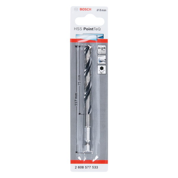 8 mm-es, hatszögletű fúrószár fémhez, HSS POINTTEQ; fúrógépekhez, csavarozókhoz, ütvefúrókhoz, ütvecsavarozókhoz. Hatlapú befogószárral rendelkező PointTeQ HSS csigafúró, amely gyors megmunkálást tesz lehetővé fémek fúrásakor. Nagy fúrási sebessége csökkenti a hőfejlődést és a fúrószár kopását; PointTeQ csúcsa folytonos élességet és hosszú élettartamot biztosít. Az önközpontosító csúcs meggátolja a fúró elmozdulását a fúrás gyors megkezdéséhez; oxid bevonatos spirálja gyors forgácseltávolítást biztosít. Hatlapú befogószár a maximális erőátvitel érdekében, szabványos hárompofás fúrókhoz és hatszögű fúró-, csavarozógép tokmányokhoz.