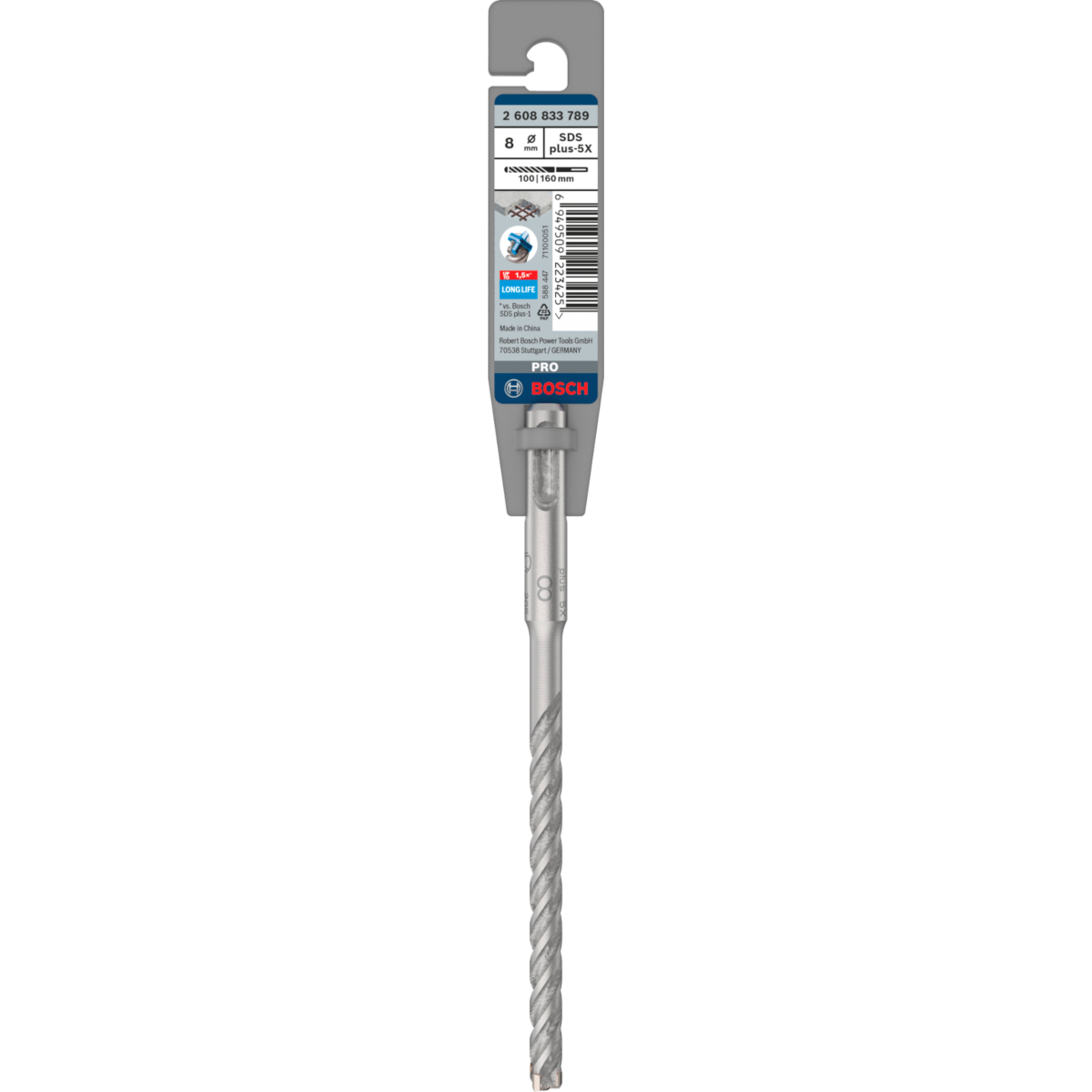 Bosch SDS Plus-5X fúrószár kalapácsfúróhoz. Az SDS Plus-5X fúrószárral hatékonyan fúrható vasbeton, beton, mész és homoktégla, tömör tégla és kemény kő. A 4 élű fej geometriai kialakítása az optimális minőség érdekében meggátolja az elakadást és törést. A 4 hornyos kivitel gyors poreltávolítást és kisebb kopást eredményez, amivel meghosszabbítható a fúrószár élettartama. Minden SDS Plus kalapácsfúróval használható. Átmérő: 8 mm. Munkahossz: 100 mm. Teljes hossz: 160 mm.