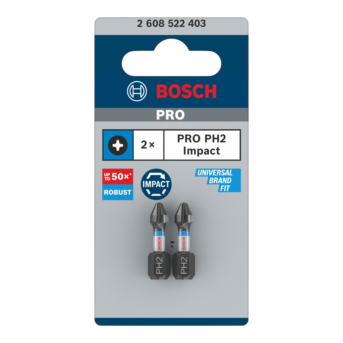 25 mm-es csavarozóbit PH2 2 db/csomag kiszerelésben, Bosch Impact Control; csavarhúzókhoz; meghosszabbított torziós zónája miatt kivételesen tartós a hosszan tartó munkához; S2 módosított acél anyaga és az optimalizált hőkezelés különleges tartósságot biztosít, és nagy teljesítményre teszi képessé.