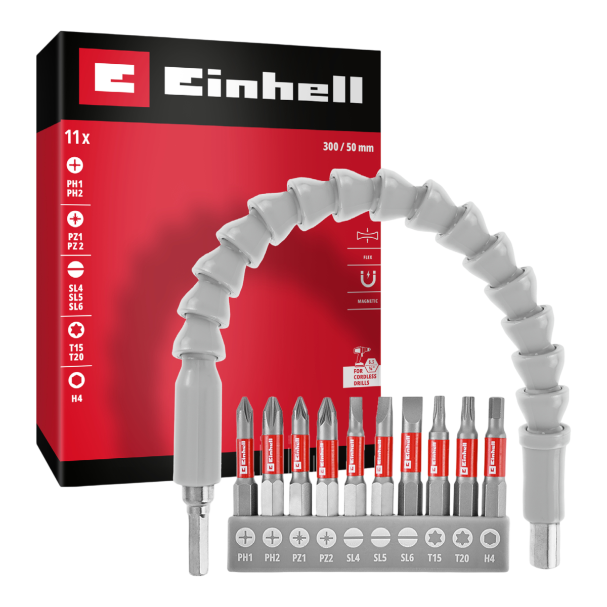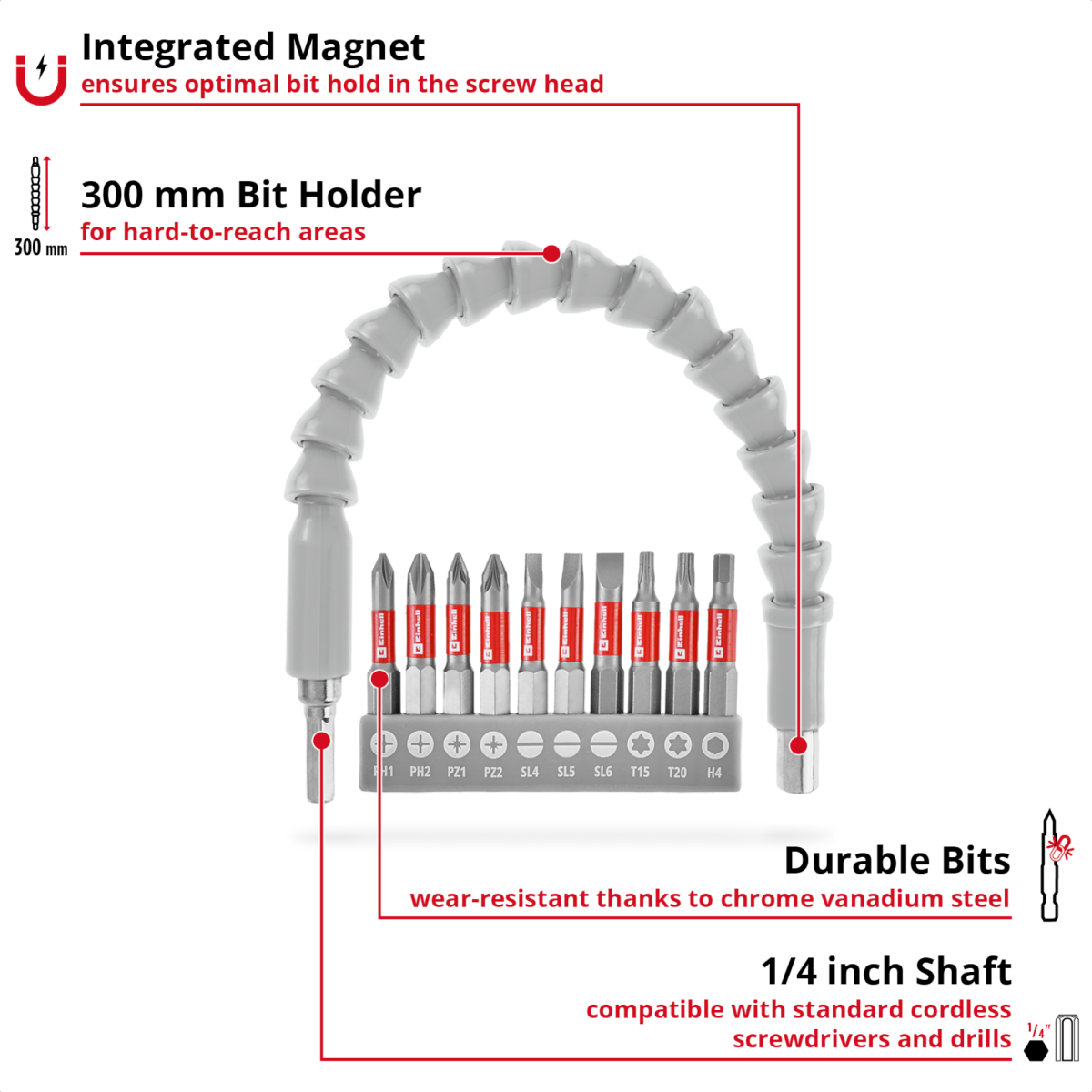 Rugalmas behajtószár + strapabíró bitek vezeték nélküli fúrókhoz/csavarozókhoz. A flexibilis tengely megkerüli az akadályokat, így szűk, takart helyeken is pontosan tudsz dolgozni – kényelmesebben és gyorsabban.