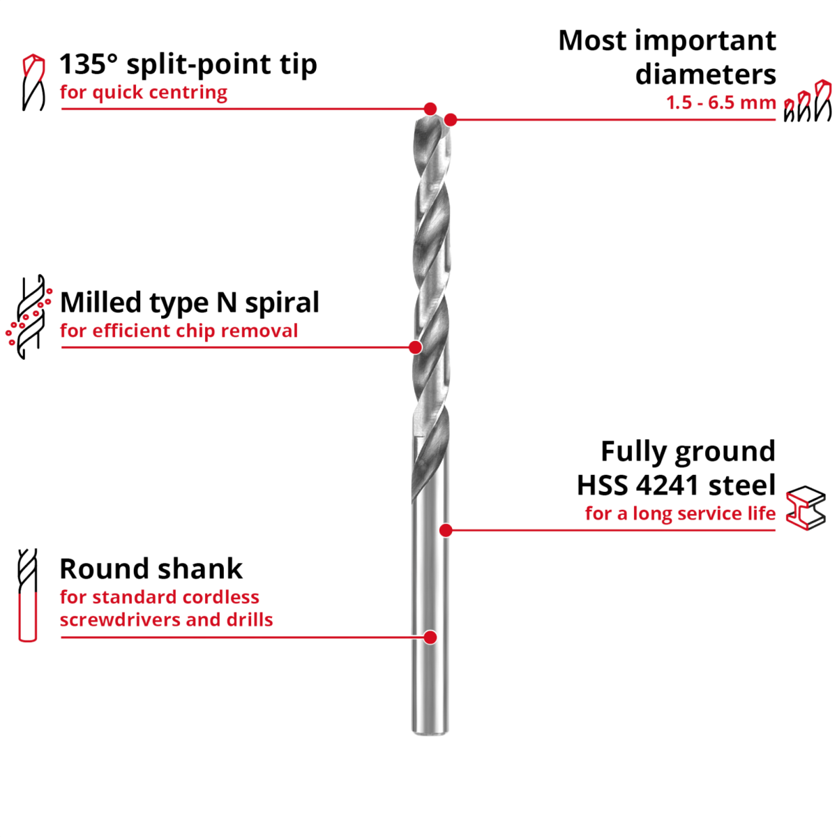 Tartós, pontos fúrás mindennapi fémmunkákhoz. A teljesen köszörült, magasan polírozott HSS 4241 acél és a 135°-os osztott hegy gyors központosítást és tiszta furatot ad.