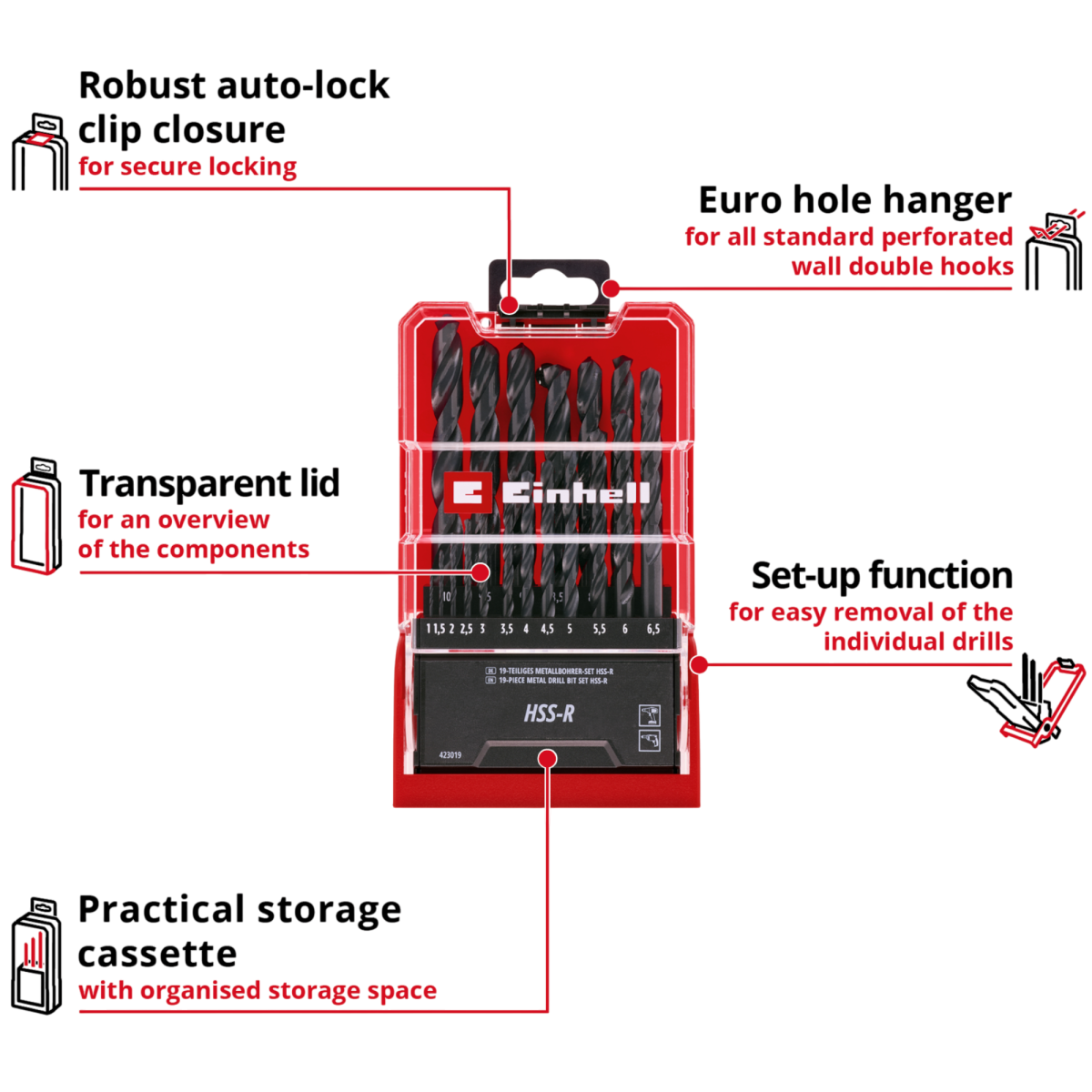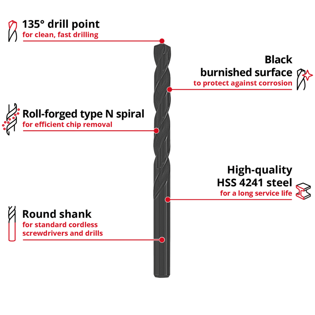 Mindennapi barkács és szerelési feladatokra összeállított, megbízható fekete felületű HSS készlet. Pontos indulás, jó forgácskihordás, szabványos gépekkel kompatibilis.