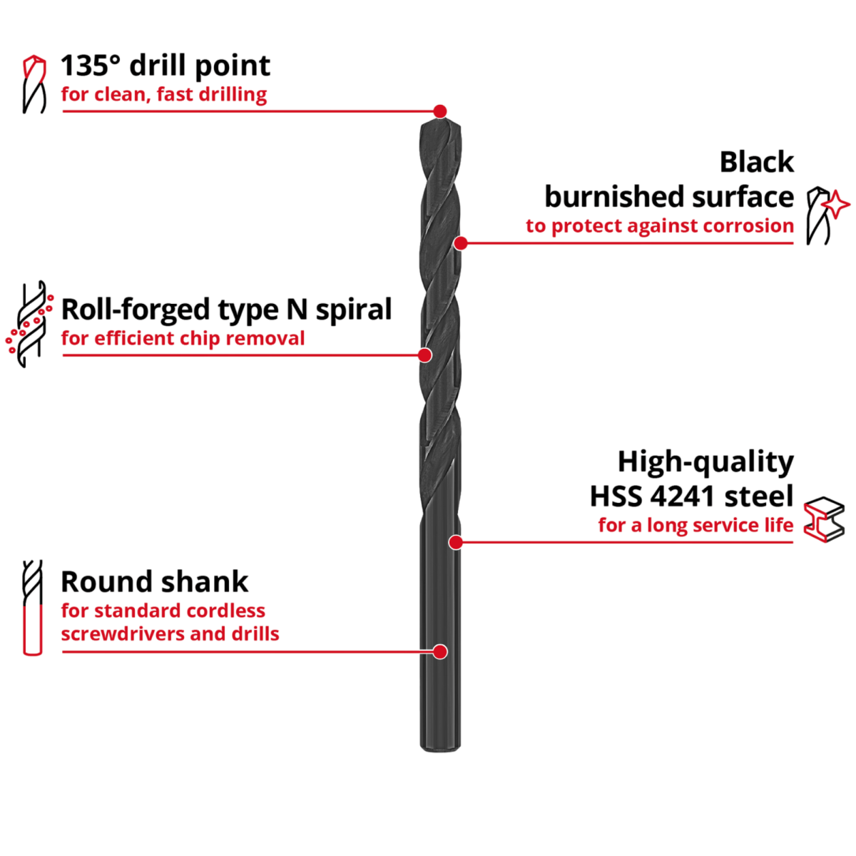Megbízható, mindennapi fúrás nemvasfémekhez, alumíniumhoz, vékony lemezekhez és műanyagokhoz. A fekete felületű, hengerelt HSS-R szárak tiszta furatkezdést és jó forgácskihordást adnak.