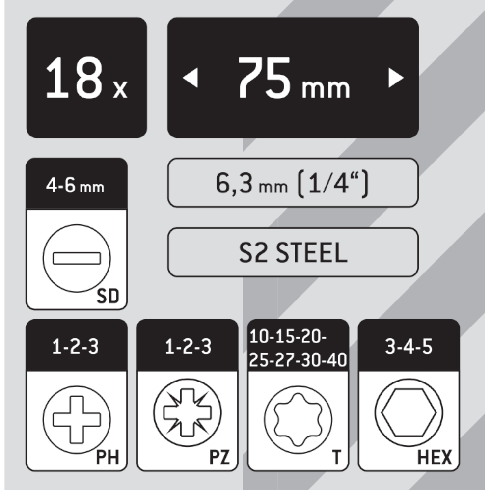 Ez az extra hosszú bitkészlet 18 különböző darabbal minden általános csavarhajtáshoz ideális, legyen szó nehezen elérhető helyeken végzett munkáról vagy speciális csavarokról. A 1/4"-es méret és az egyedi bitek biztosítják a tökéletes illeszkedést, így gyors és hatékony csavarozást tesznek lehetővé. A tartós és praktikus készlet kiváló választás mind otthoni, mind professzionális felhasználásra, ahol a pontosság és megbízhatóság kulcsfontosságú.