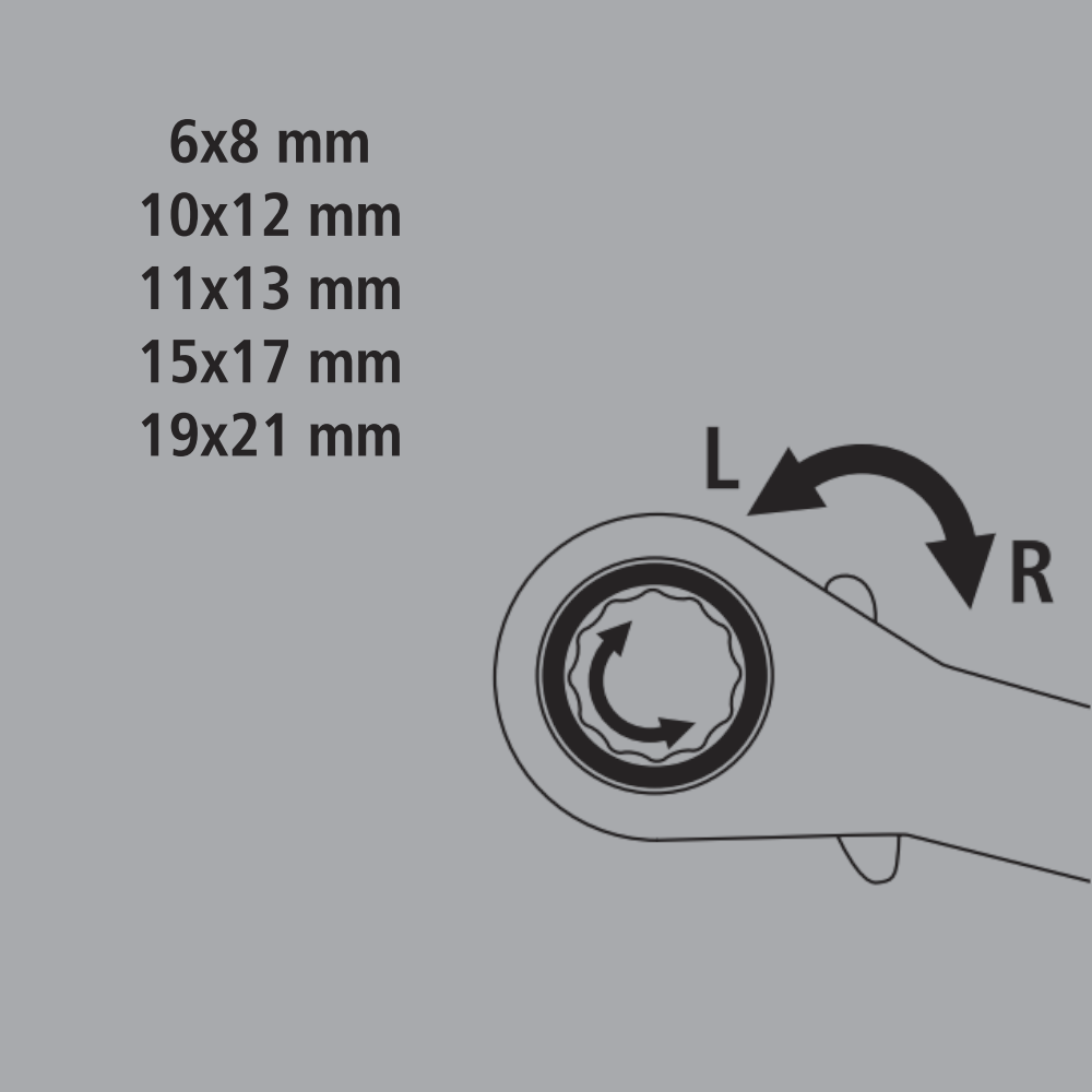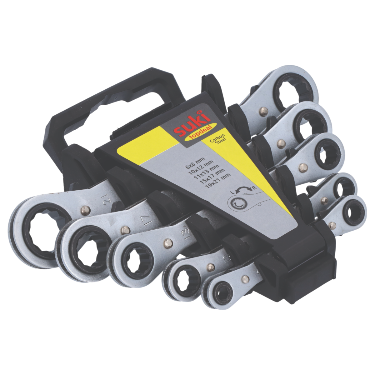 Ez a racsnis csavarkulcs készlet 5 db különböző méretű kulcsot tartalmaz (6-21 mm), ideális választás az anyák és csavarok gyors meghúzására vagy lazítására.