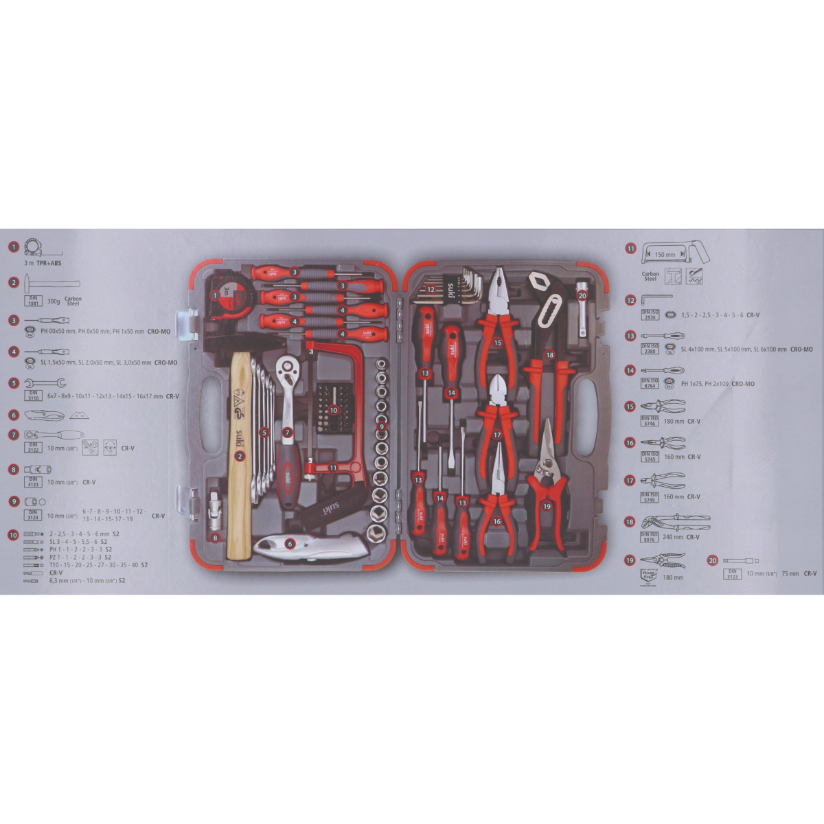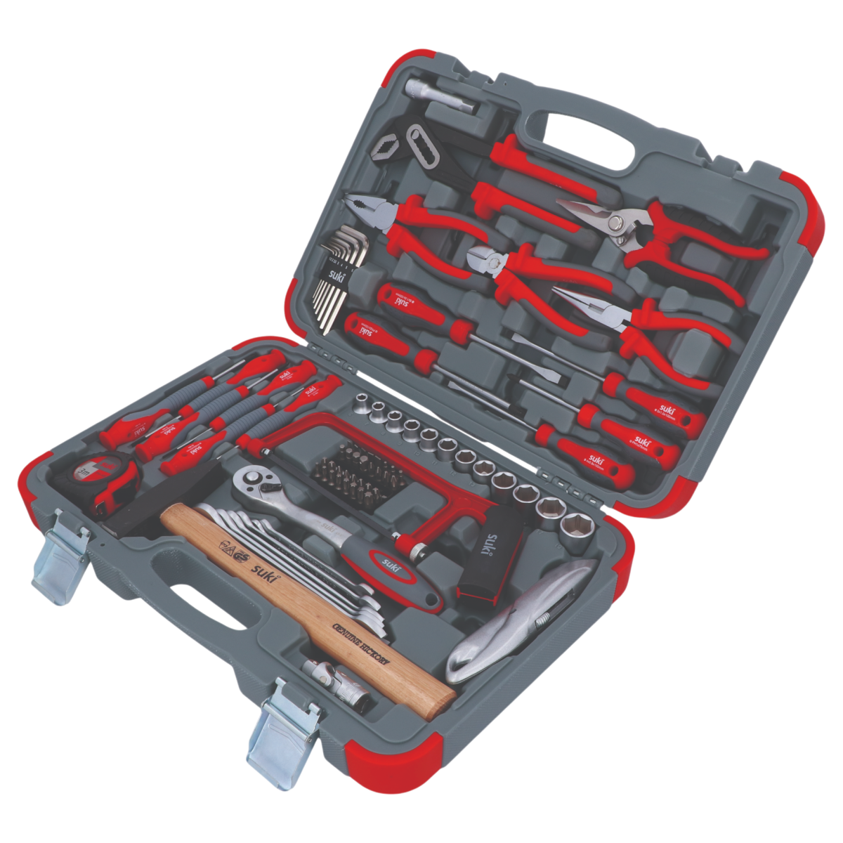 A Suki 81 részes szerszámkészlet minden területen alkalmas univerzális szerszámhasználatra, és széleskörű eszközkínálatot biztosít. A készlet tartalmaz fogót, fűrészt, kés, forgatható racsnis kulcsot, biteket, ollót, csavarkulcsokat, mérőszalagot, imbuszkulcsokat, vízpumpa fogót, csavarhúzókat, valamint DIN szerint kovácsolt kalapácsot minőségi hamunyéllel és állítható csavarkulcsot. Minden eszköz praktikus tárolóban helyezkedik el, így kényelmesen és rendezetten hozzáférhetők.