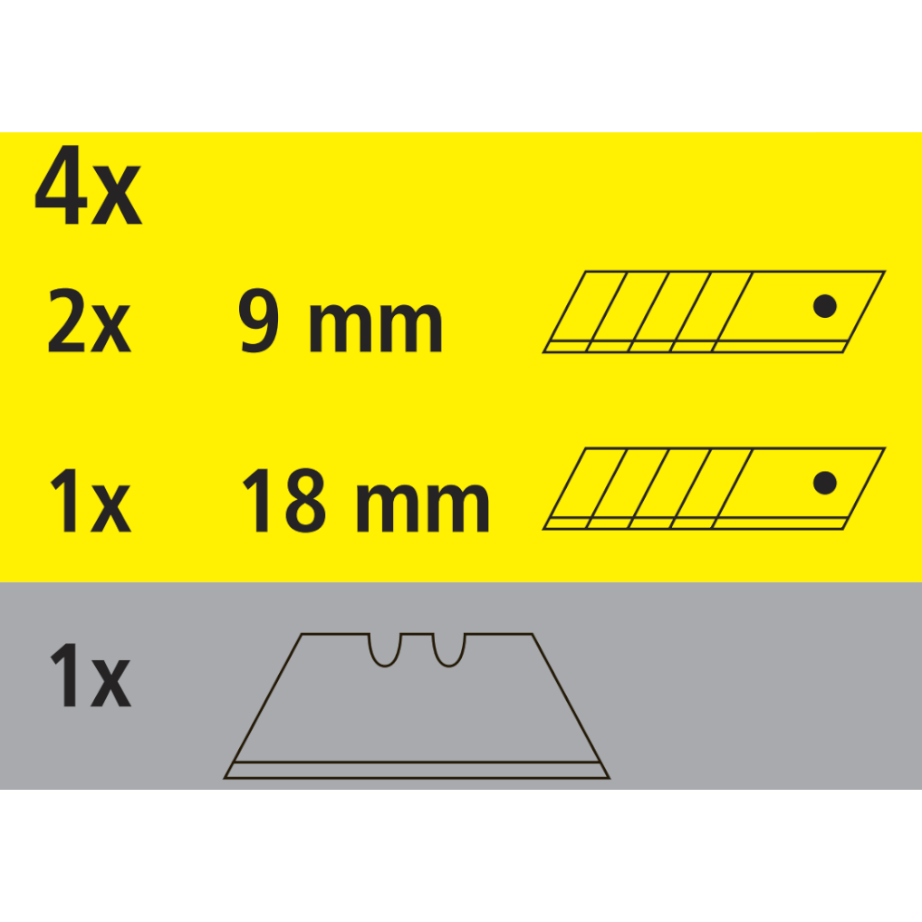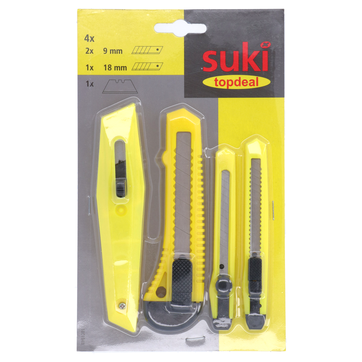 Ez a 4 részes SUKI késkészlet 9 mm-es és 18 mm-es trapéz, KS és TD típusú pótpengelemezeket tartalmaz, amelyek minden anyag univerzális vágására alkalmasak. A lepattintható pengék gyors cseréje biztosítja a folyamatos munkavégzést, miközben a különböző formák lehetővé teszik a precíz vágásokat különböző felületeken. Ideális választás otthoni és ipari felhasználásra egyaránt, köszönhetően a széleskörű alkalmazhatóságnak és a tartós kivitelezésnek.