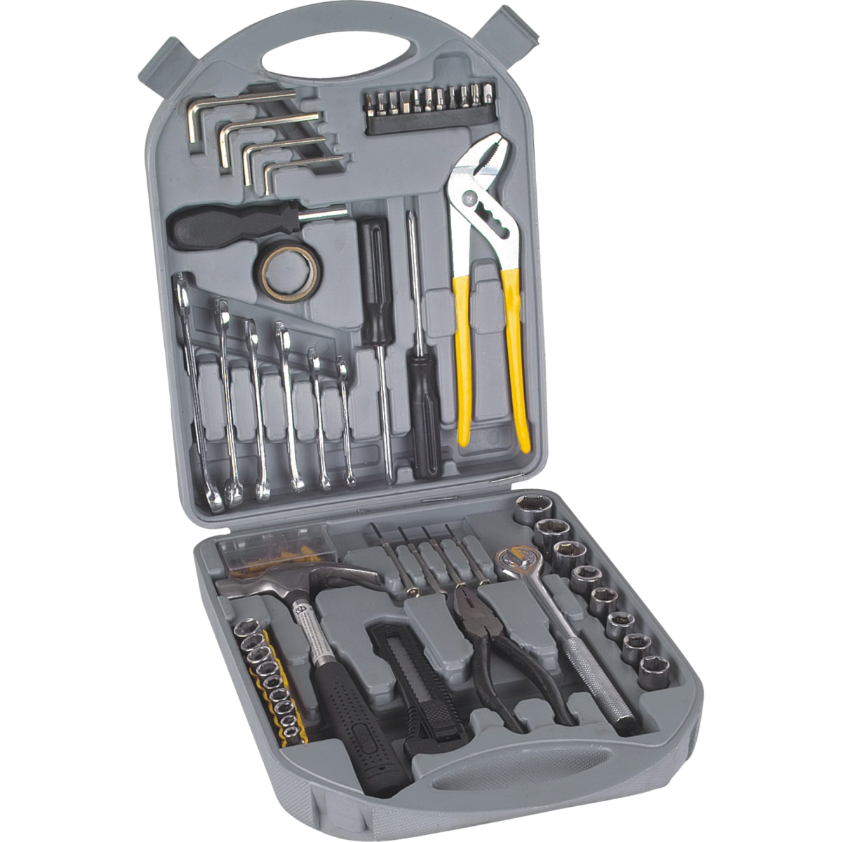 A készlet részei: 4 db imbuszkulcs, 6 db csavarkulcs, 2 db csavarhúzó, 1 db vízpumpa fogó, 8 db 3/8"-es dugókulcs betét, 9 db 1/4"-es dugókulcs betét, 11 db csavarhúzó bit, 1 db kombinált fogó, 1 db racsnis fogó, 1 db kalapács, 1 db cserélhető fejű csavarhúzó, 1 db szigetelő szalag, 1 db sniccer, 4 db precíziós csavarhúzó, 90 db-os csavar+alátét+anya készlet.