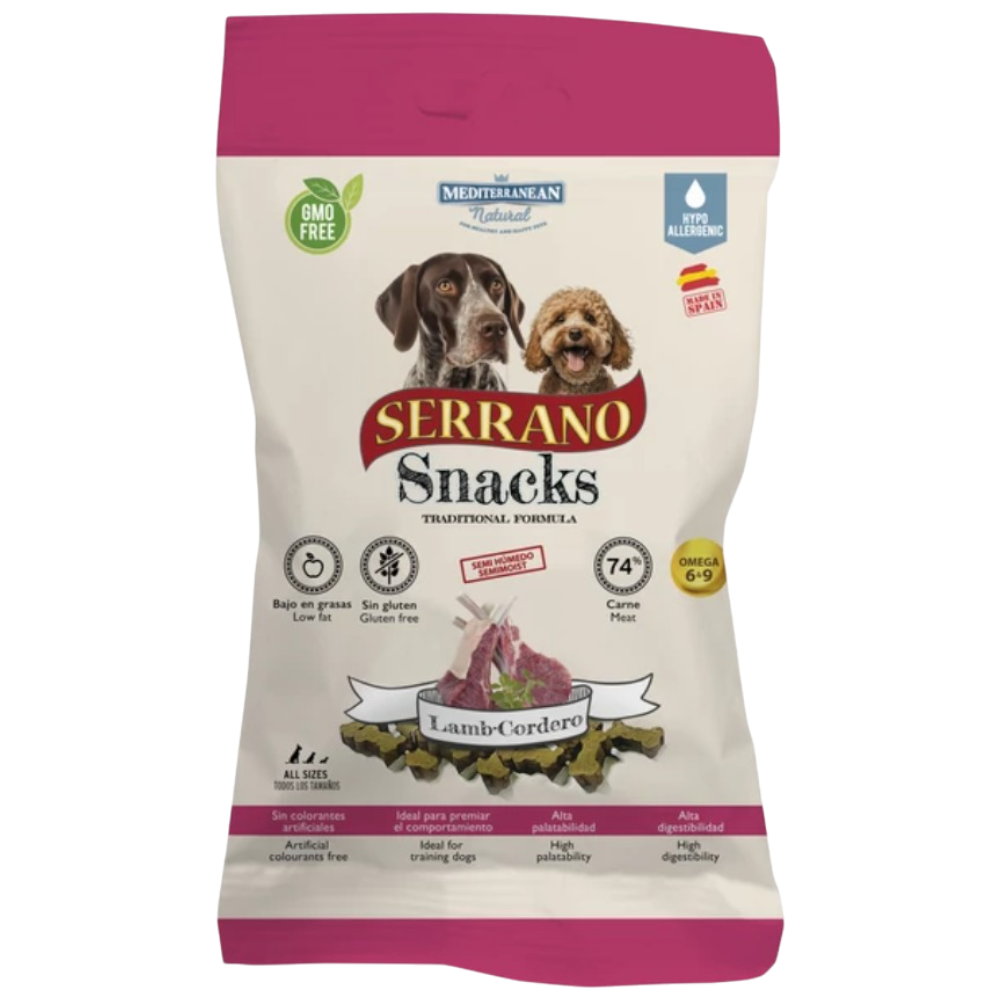 A Serrano bárányhúsos hipoallergén snack kíméletes, mégis ízletes jutalom minden méretű kutyának. A receptúrában a 46% serrano sonka és 28% bárányhús biztosít természetes fehérjeforrást, a rizs és a zöldségek (zöldborsó, sárgarépa) pedig a könnyű emészthetőséget. Természetes rozmaring ad ízt, a tokoferolok antioxidánsként segítenek megőrizni a frissességet.