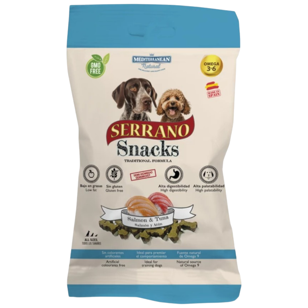 A Serrano Snacks lazaccal és tonhallal készült jutalomfalat ízletes és tápláló kiegészítő eledel minden korú kutya számára. A 40% serrano sonkát, 15% csirkehúst, valamint 10–10% lazacot és tonhalat tartalmazó finomság természetes fehérjeforrás, amely támogatja az izmok egészségét és a fényes szőrzetet.