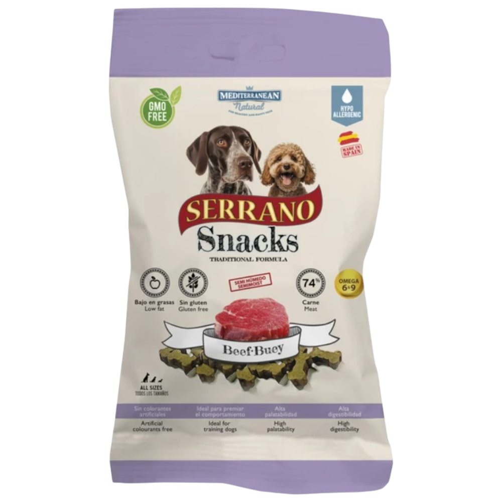 A Serrano Snacks marhahússal hipoallergén jutalomfalat ideális választás minden méretű és korú kutya számára, különösen az érzékeny emésztésűeknek. A 46% serrano sonka és 28% marhahús természetes fehérjeforrásként szolgál, míg a rizs és a zöldségek (zöldborsó, sárgarépa) hozzájárulnak a kiegyensúlyozott összetételhez.