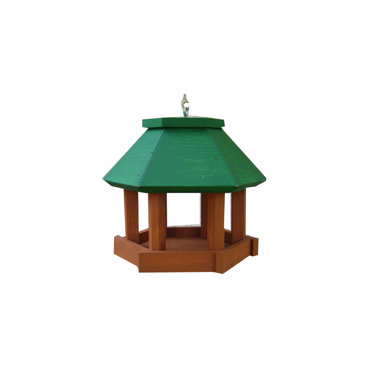 Hatszögletű madáretető fenyőfából. Függeszthető és állítható kivitelben. Méret: 26x26x25 cm. Felülete kezeletlen.