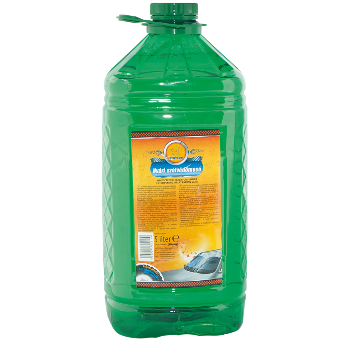 KENTAUR NYÁRI SZÉLVÉDŐMOSÓ 5L - A termék gépjárművek szélvédő üvegének ablaktörlő segítségével való tisztítására alkalmas. Eltávolítja a szélvédőre kerülő rovar, sár és egyéb szennyeződéseket. - Használata fénytörést nem okoz, a gumi és műanyag részeket, az eredeti festést, valamint a szakszerűen végzett utófényezést nem károsítja. Fényszórótisztító berendezések mosófolyadékaként is használható. KENTAUR NYÁRI SZÉLVÉDŐMOSÓ (5 L) [Azonosító: 5572] A termék gépjárművek szélvédő üvegének ablaktörlő segítségével való tisztítására alkalmas. Eltávolítja a szélvédőre kerülő rovar, sár és egyéb szennyeződéseket. Használata fénytörést nem okoz, a gumi és műanyag részeket, az eredeti festést, valamint a szakszerűen végzett utófényezést nem károsítja. Fényszórótisztító berendezések mosófolyadékaként is használható. Használata: A KENTAUR nyári szélvédőmosót hígítás nélkül töltsük a gépkocsi szélvédőmosó tartályába! Szükség esetén egymást követően 3-4 bő öblítéssel működtessük az ablaktörlő berendezést! A rovarszennyeződés mértékétől függően ismételjük meg a folyamatot! Ne hagyjuk, hogy a rovarszennyeződés a szélvédőre rászáradjon! A KENTAUR nyári szélvédőmosó esős időben is könnyíti a szélvédő tisztítását. FIGYELEM! Tűző napon álló gépkocsi szélvédőjének tisztítására ne alkalmazzuk az ablakmosó berendezést, mert a felhevült karosszériára jutó folyadék károsíthatja a lakkozást! Élelmiszerektől távol, gyermekek elől elzárva tartandó! Ha szemébe kerül, azonnali bővizes öblítés szükséges! A folyadék nem éghető. Fagymentes helyen tároljuk! Összetevők: anionos felületaktív anyag