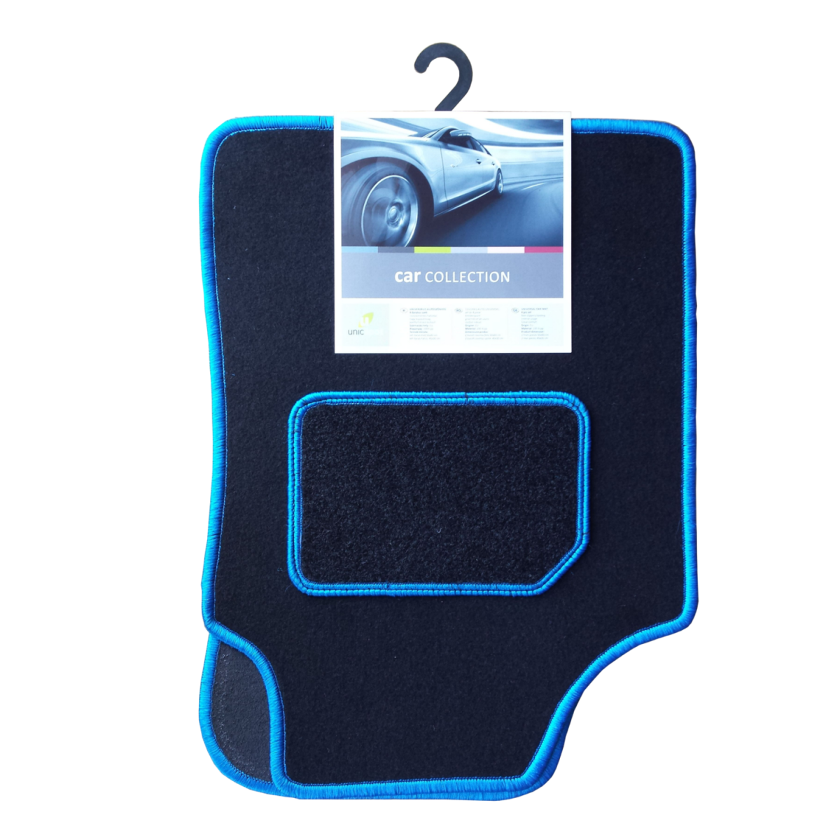 4 részes (2 db az első és 2 db a hátsó üléshez), fekete velúr, színes fonalas szegéssel, sarokvédő taposóval. Méret: kisebb (hátsó): 0,5x40x30cm, nagyobb (első): 0,5x50x70cm. Az esős, havas, latyakos időben megvédi autóját.