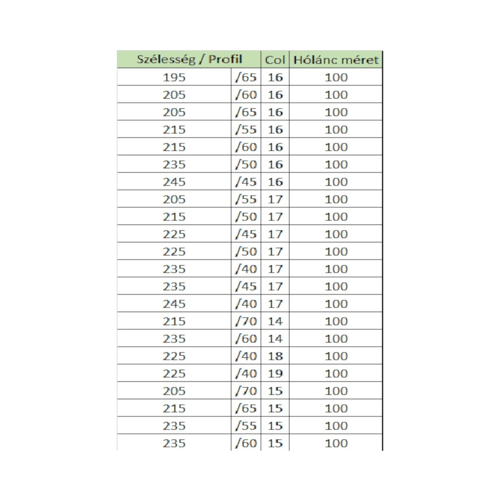 A csomagolt terméken nem az összes méret került feltüntetésre! A termékhez tartozó (a fotók között, a műszaki rajzon is látható) teljes gumiméret-lista az alábbi, a hólánc az ebben szereplő gumiméretekhez megfelelő: