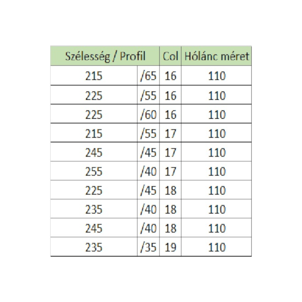 A csomagolt terméken nem az összes méret került feltüntetésre! A termékhez tartozó (a fotók között, a műszaki rajzon is látható) teljes gumiméret-lista az alábbi, a hólánc az ebben szereplő gumiméretekhez megfelelő: