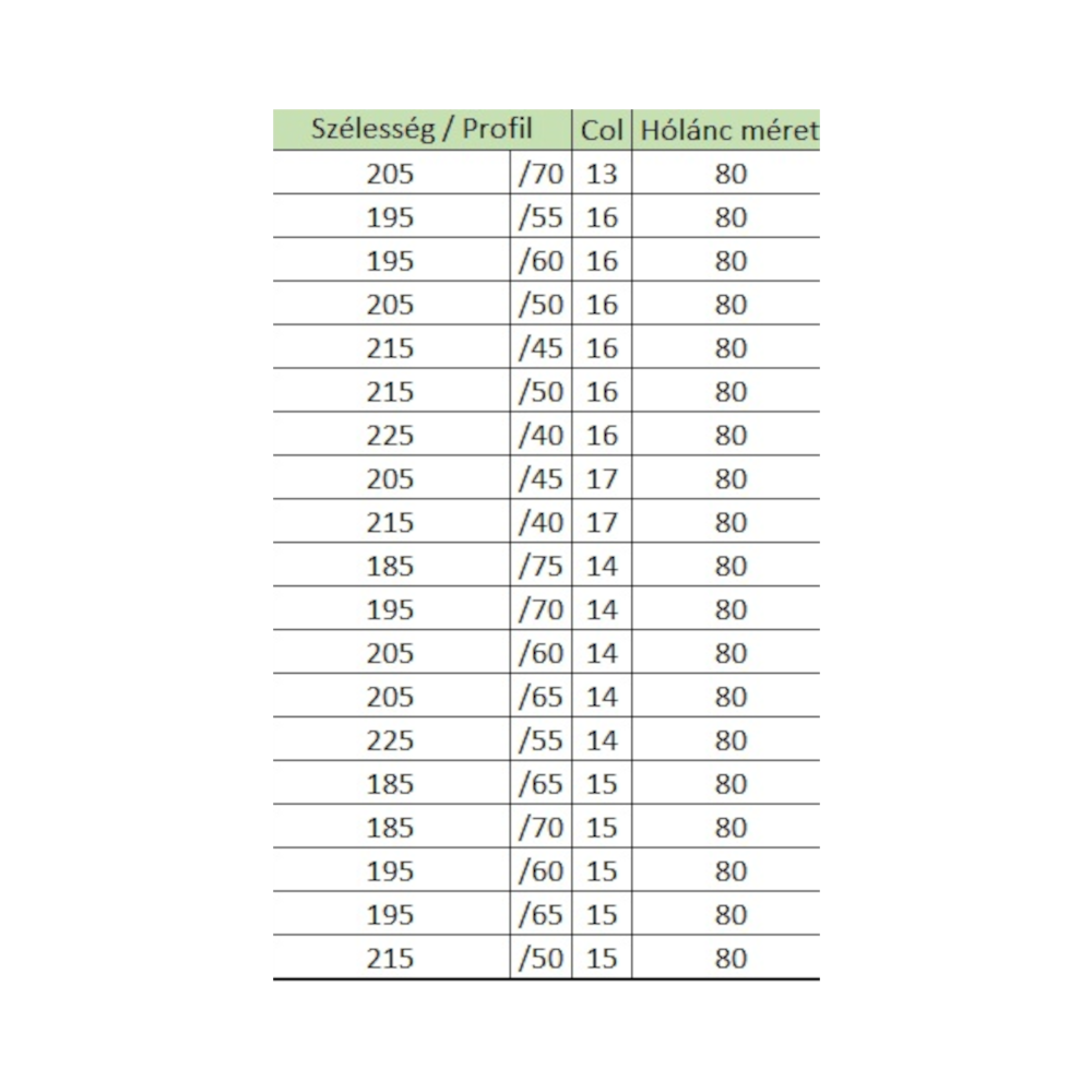 A csomagolt terméken nem az összes méret került feltüntetésre! A termékhez tartozó (a fotók között, a műszaki rajzon is látható) teljes gumiméret-lista az alábbi, a hólánc az ebben szereplő gumiméretekhez megfelelő:
