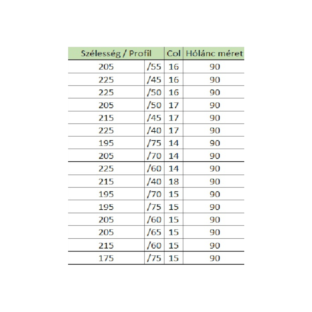 A csomagolt terméken nem az összes méret került feltüntetésre! A termékhez tartozó (a fotók között, a műszaki rajzon is látható) teljes gumiméret-lista az alábbi, a hólánc az ebben szereplő gumiméretekhez megfelelő: