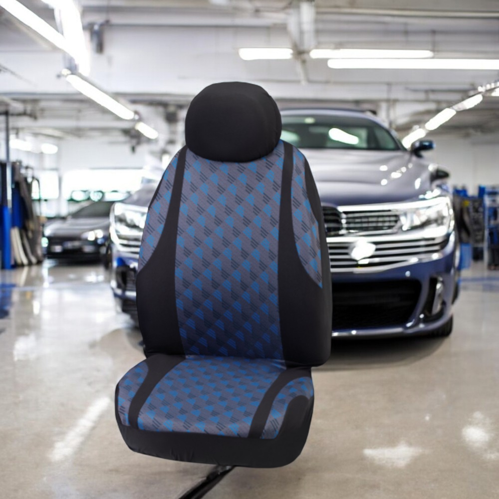 Üléshuzat szett "JAQUARD", 9 részes: 2 db első, 2 db hátsó üléshuzat és 5 db fejtámla huzat, fekete-kék színben, 100 % poliészter, univerzális méret, a termék oldallégzsákos ülésekhez nem használható!