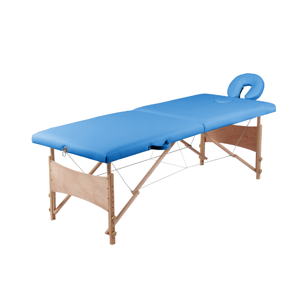 Két zónás, összecsukható masszázs ágy, fa vázzal és műbőr kárpitozással és fejtámasszal, kék színben. A szállításhoz pár mozdulattal összecsukható, az összeállítása is mindössze pár perc. A csomag tartalmaz egy vászon táskát, ami megakadályozza a szállításkori koszolódást. Az ágy magassága állítható az ideális póz megtalálásához, mérete: 186x60x59-82cm, max. terhelhetőség: 150kg.