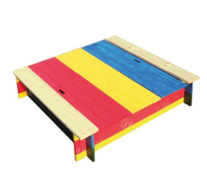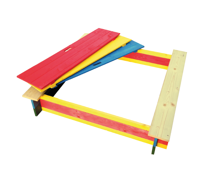 Fa homokozó tetővel.