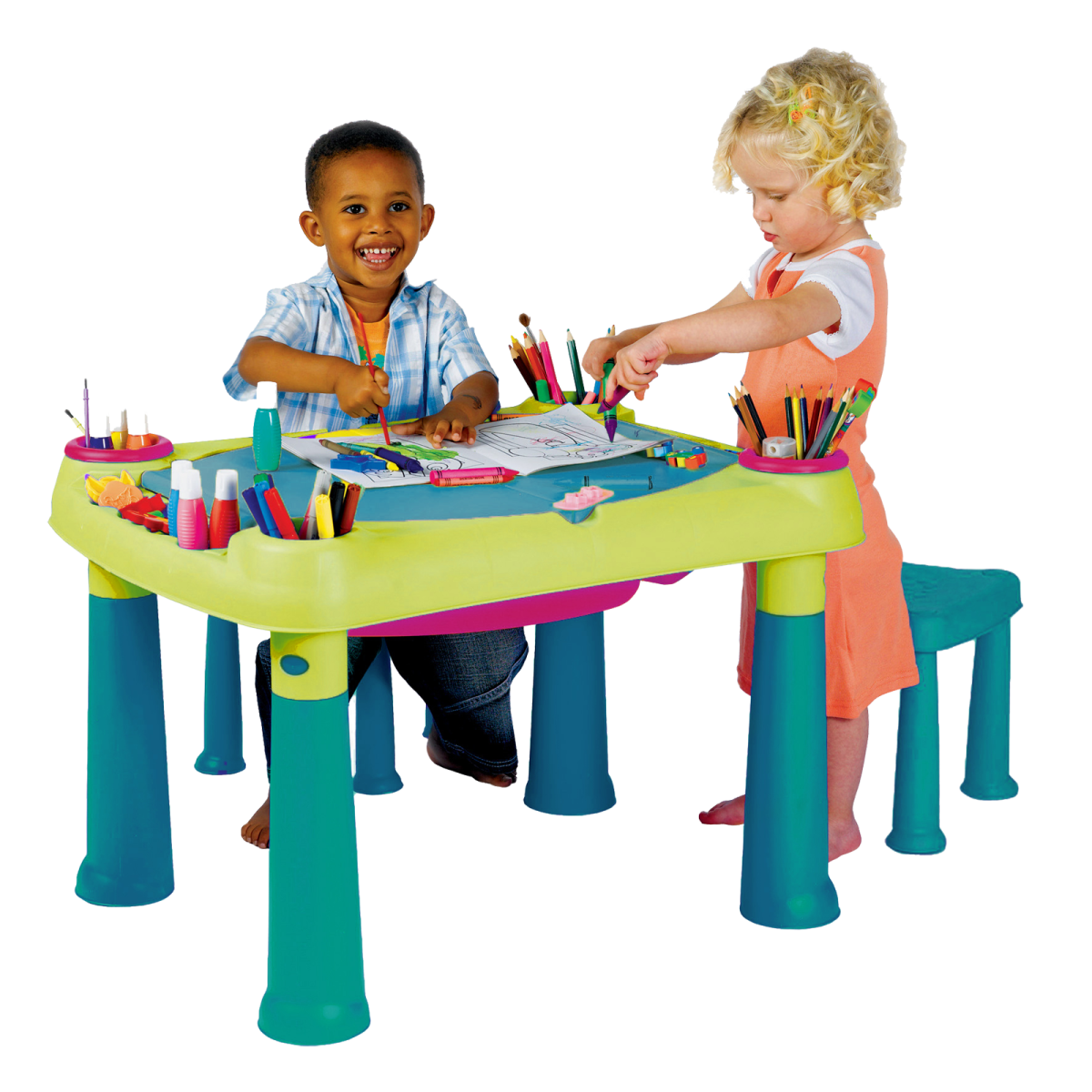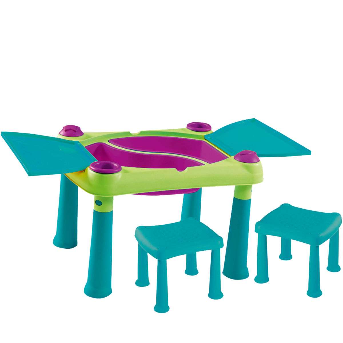 Terülj, terülj ... asztalkám! Rajzokkal, gyurmával, kockákkal - mindennel, ami szükséges lehet a kreatív játékhoz! Kivételesen kényelmes creative table bútor egy asztal két ülőhellyel minden gyerek fantáziáját felkelti és látványossá teszi a szeretteitekkel eltöltött időt. A terméket a gyerekszobába, valamint a teraszra vagy a kertbe állíthatja. A rajz- és egyéb eszközök tárolására kialakított speciális hely megkönnyíti a rend fenntartását. A magas minőségű műanyagból készült stabil szerkezet hosszú éveken át garantálja az asztal használatát.