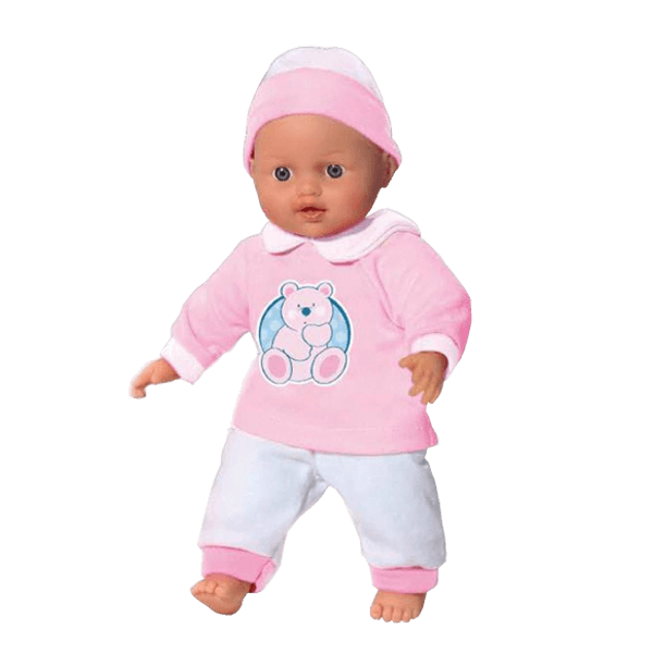 A készlet tartalma: 1 db baba. 3 darab LR44-es gombelemmel működik, amelyeket a csomagolás tartalmaz. Élénk rózsaszín, kék és fehér színei, valamint maci mintája vidámságot sugároznak. Anyaga műanyag és textil. A baba mérete: 30 cm. 10 hónapos kortól ajánlott.