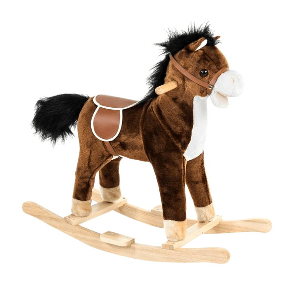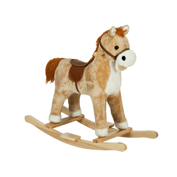 Hintaló hanggal barna/ bézs színben.Mentsd meg a királylányt vagy indulj csatába ezzel a hintalóval! A hintaló egy régebbi klasszikus játék, amely már a dédszüleidet is szórakoztatta. A múlt században évtizedekig nagy népszerűségnek örvendett, nem véletlenül, hiszen számos szerepjátékra ad lehetőséget. A játék egy lovacska formájú hintaló amely kapaszkodókkal van felszerelve. A póni fülét megnyomva galoppozó, vágtató hangot is ki tud adni magából, ezzel még nagyobb élménnyé téve a játékot. A szerepjátékok számos fejlesztésre adnak lehetőséget. Játék közben fejlődik a kreativitás, a képzelőerő, elősegítik a szociális, értelmi, valamint érzelmi fejlődést, s tökéletesek arra, hogy a gyerekek olyan szerepeket próbáljanak ki, amelyekkel csak a képzeletükben vagy felnőtt korban fognak találkozni. A hintaló mindezek mellett fejleszti a mozgáskoordinációt és az egyensúlyérzéket is. Anyaga szőrme és fa. A hintaló mérete: 74 x 30 x 60 cm. A termék súlya 5 kg. A játék maximális terhelhetősége 30 kg. 3 éves kortól ajánlott.