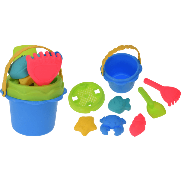 Műanyag homokozó szett, mérete 18x18x13 cm. Szett tartalma: szita, lapát, gereblye, homokozó forma.