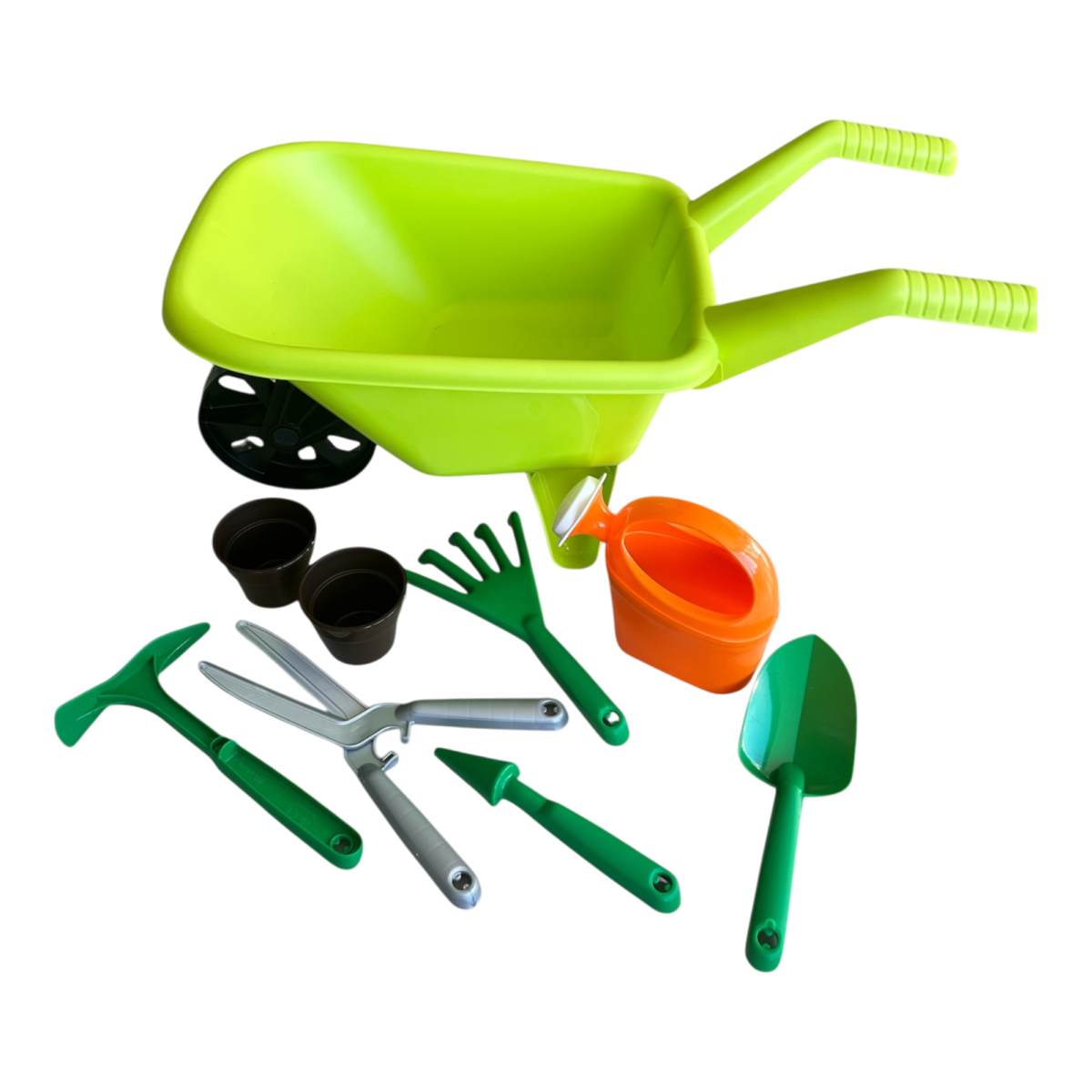 A készlet mindent tartalmaz, amire a kis kertészeknek szükségük lehet: olló, lapát, gereblye, öntözőkanna, palántázó, kapa és két kis edény is helyet kapott benne.