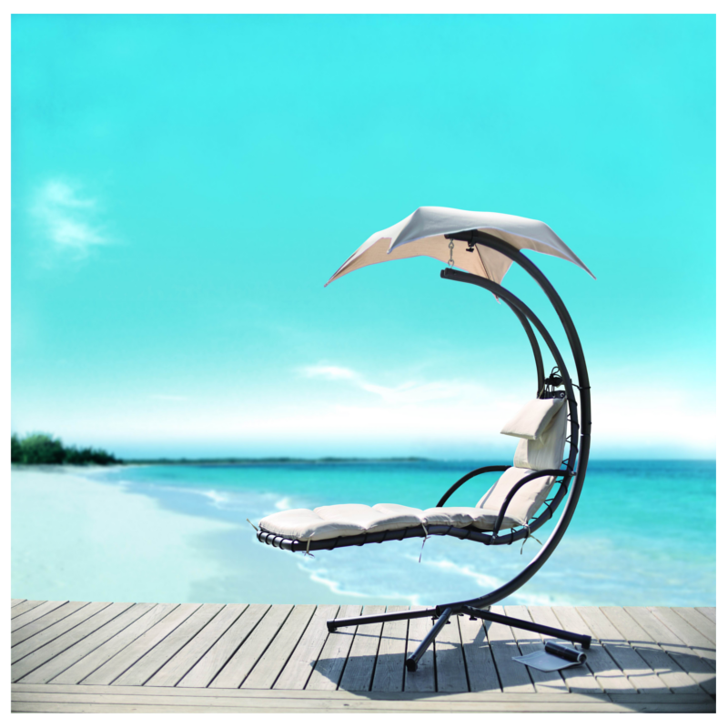 Függő napágy erős acél vázzal, kényelmes, párnás fekvőfelülettel és praktikus napernyővel. Bézs színű.