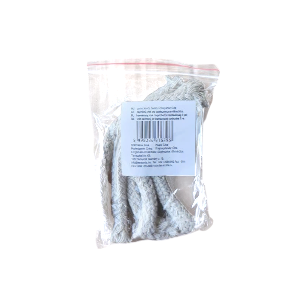 Pamutból készült tartalék kanóc csomag bambuszfáklyához történő alkalmazáshoz. Az elhasználódott kanóc helyettesítésére. Egyszerűen alkalmazható és cserélhető. A csomag 5 db kanócot tartalmaz. Az életképek tájékoztató jellegűek!