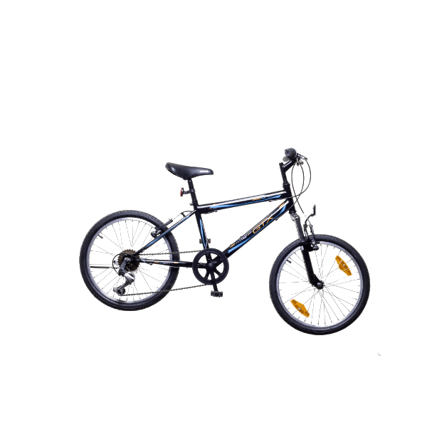 Acél merev váz, teleszkópos acél villa, alumínium felni, Shimano váltó, 6 sebességes, műanyag V fék, acél hajtómű, acél kitámasztó, MTB gyerek nyereg, golyós pedál.