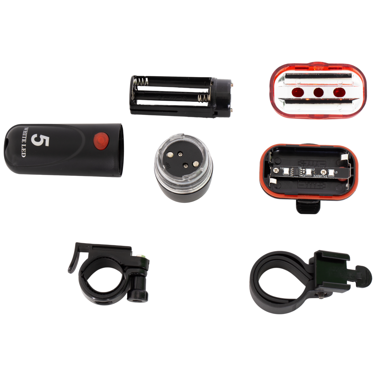 Ez a kerékpáros világításszett egy első és egy hátsó lámpát tartalmaz, amelyek biztonságos közlekedést biztosítanak akár városi, akár szabadidős használat során. Az első lámpa 5 fehér LED-del és 100 lumen fényerővel dolgozik, 4 funkcióval, esőálló kivitelben, kormányra szerelhető tartóval. A hátsó villogó 3 piros LED-del, 50 lumen fényerővel és szintén 4 funkcióval rendelkezik, nyeregcsőre rögzíthető bilincses tartóval. Mindkét lámpa cseppálló és AAA elemmel működik, így egyszerűen üzemeltethető. Ideális választás mindennapi kerékpározáshoz, hogy mindig jól látható legyen az úton.