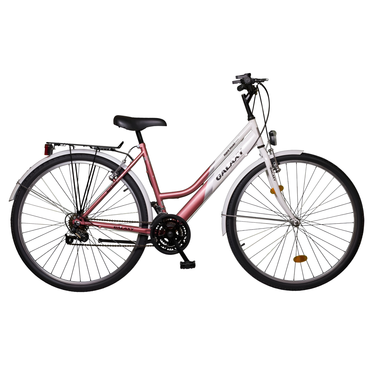 Galaxy HardRoad 28-as női trekking kerékpár, acélvázas, 18 sebességgel. Pozícionált váltókarok, alumínium fékek és alu-plasztik sárvédő jellemzi a gazdag felszereltséget. Megtalálható rajta az alapfelszereltségen felül: könnyített alu-plasztik sárvédő, leszorítóval szerelt cső profilú csomagtartó, működésre kész elemes világítás.