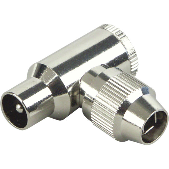 TV-k és antenna erősítők, antenna konnektorhoz való csatlakoztatásához 90°-os csatlakozó, amely lerövidíti a hosszú kábelek hajlását és megakadályozza a belső vezető megtörését. Clip-on belső vezető. Fémház. Méretek: - 0,5-1,1 mm (belső vezető) - 4-7,5 mm (kábel).