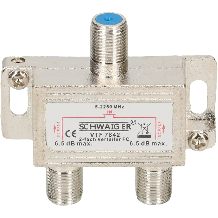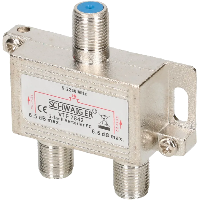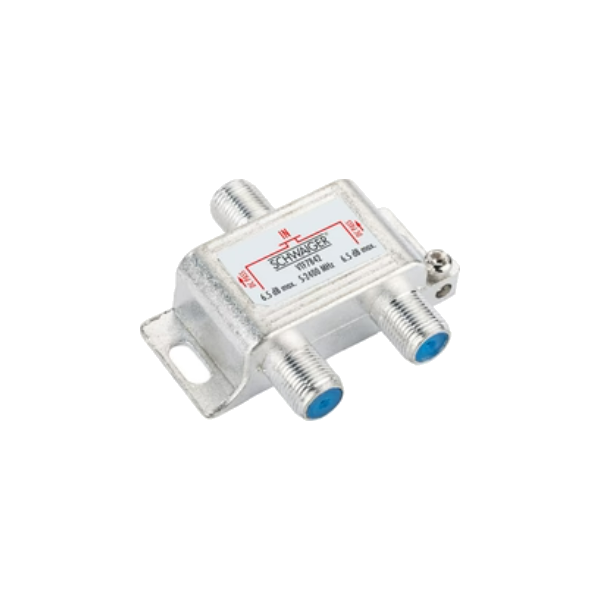 Antenna és szatelit jelosztó kábel, antenna és műhold rendszerek csatlakoztatására. 1 db bemenet, 2 db kimenet. Könnyű és kompak dizájn. Egyenáramú – egyenáram továbbítás aktív antennához. Csillapítás: 6,5 dB. Frekvenciatartomány: 5-2250 MHz.