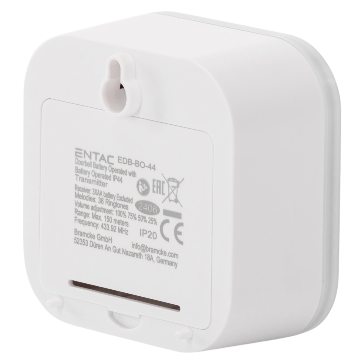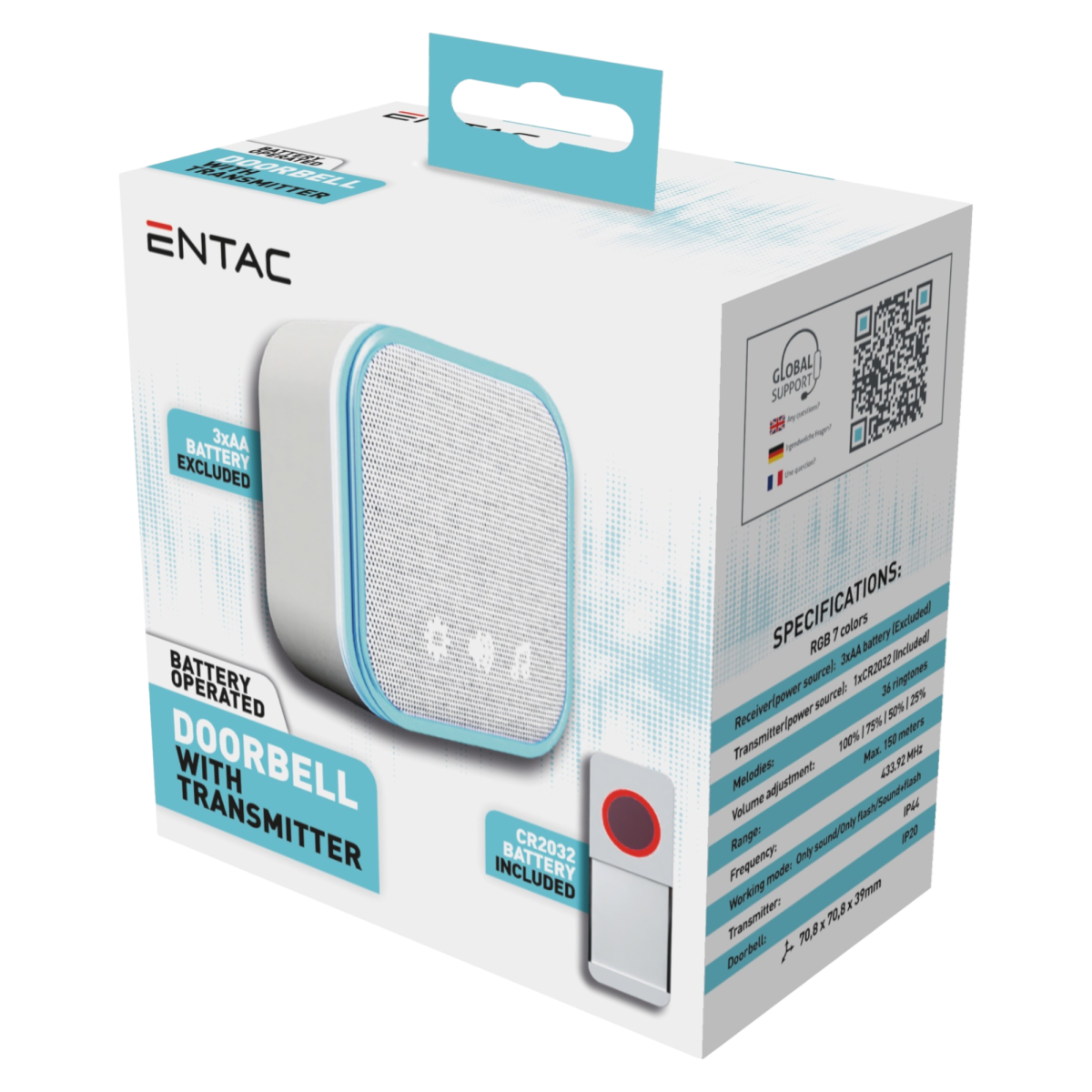 Az Entac elemes ajtócsengő ideális megoldás, ha egyszerű, vezetékmentes csengőt keresel otthonodhoz vagy irodádhoz. A beltéri egység 3 db AA elemmel működik (nem tartozék), míg a kültéri nyomógomb CR2032 elemmel üzemel, ami a csomag részét képezi.