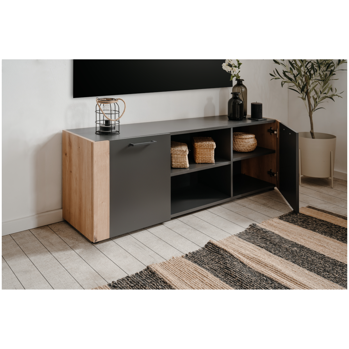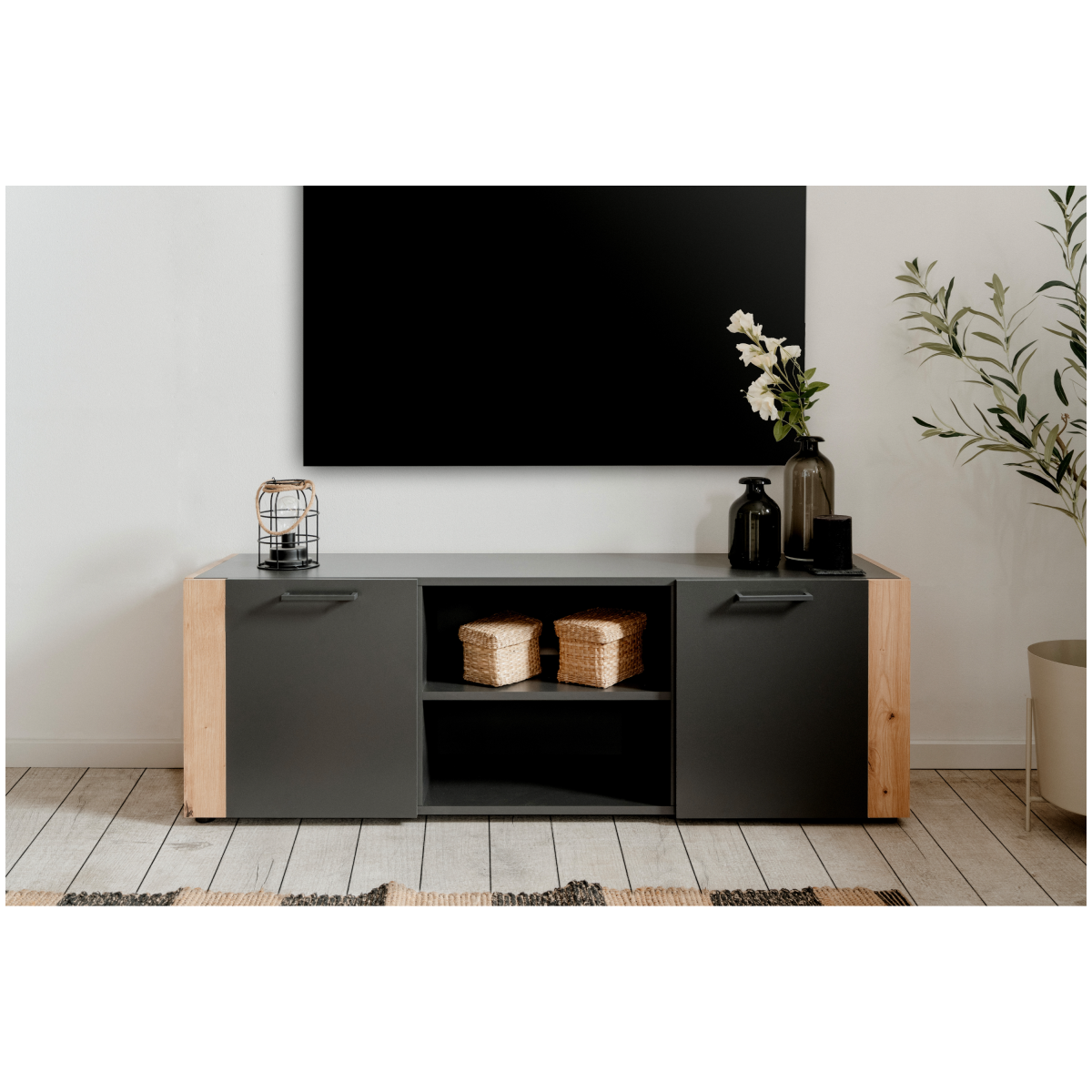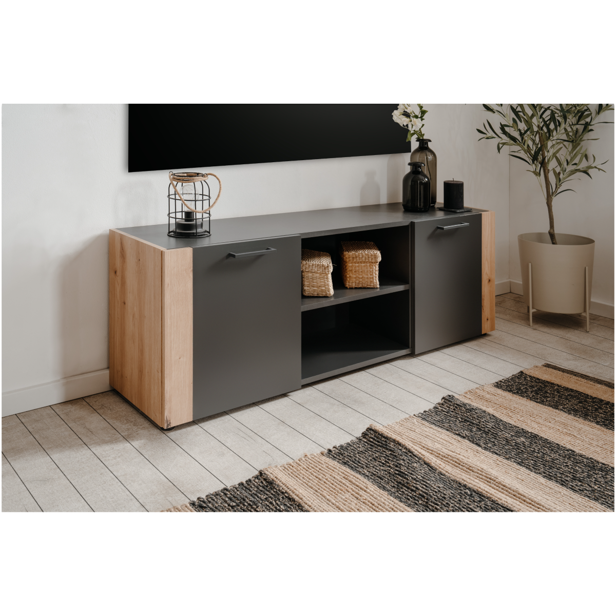 A Cento 56A TV szekrény modern, letisztult formavilágával és praktikus belső elrendezésével stílusos kiegészítője a nappalinak. Az antracit szürke felületek és az artisan tölgy fa hatású elemek elegáns, időtálló összhatást teremtenek, amely könnyen illeszkedik különböző lakberendezési stílusokhoz.