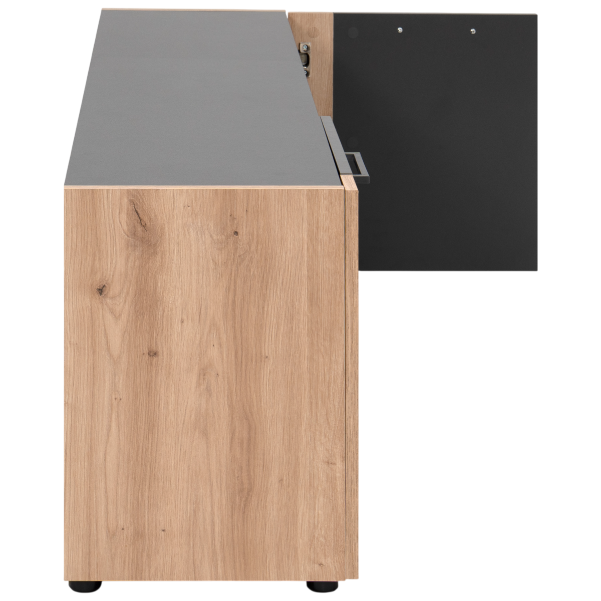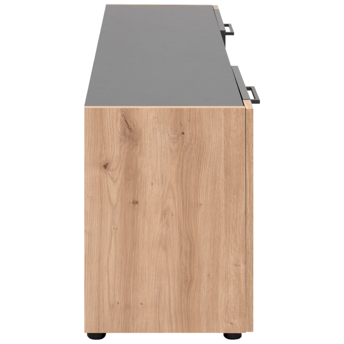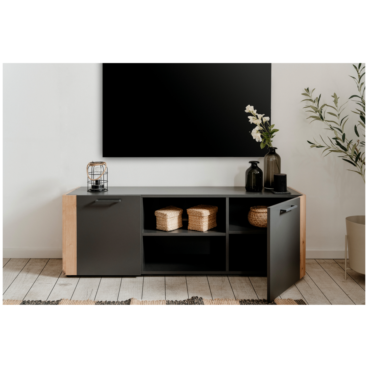 A Cento 56A TV szekrény modern, letisztult formavilágával és praktikus belső elrendezésével stílusos kiegészítője a nappalinak. Az antracit szürke felületek és az artisan tölgy fa hatású elemek elegáns, időtálló összhatást teremtenek, amely könnyen illeszkedik különböző lakberendezési stílusokhoz.