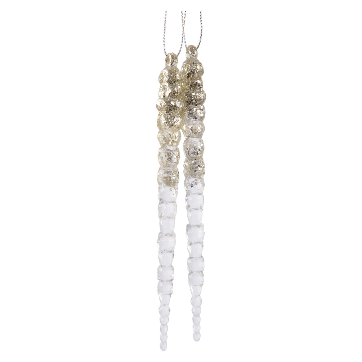 Ez a 2db-os szett különleges, akrilból készült jégcsap díszeket tartalmaz, amelyek elegáns és fényes kiegészítői lehetnek szinte bármilyen stílusú beltéri téli dekorációnak, karácsonyfának. A felső részen arany glitteres bevonat, az alsó részen áttetsző akril felület biztosítja a látványos, mégis letisztult megjelenést.
