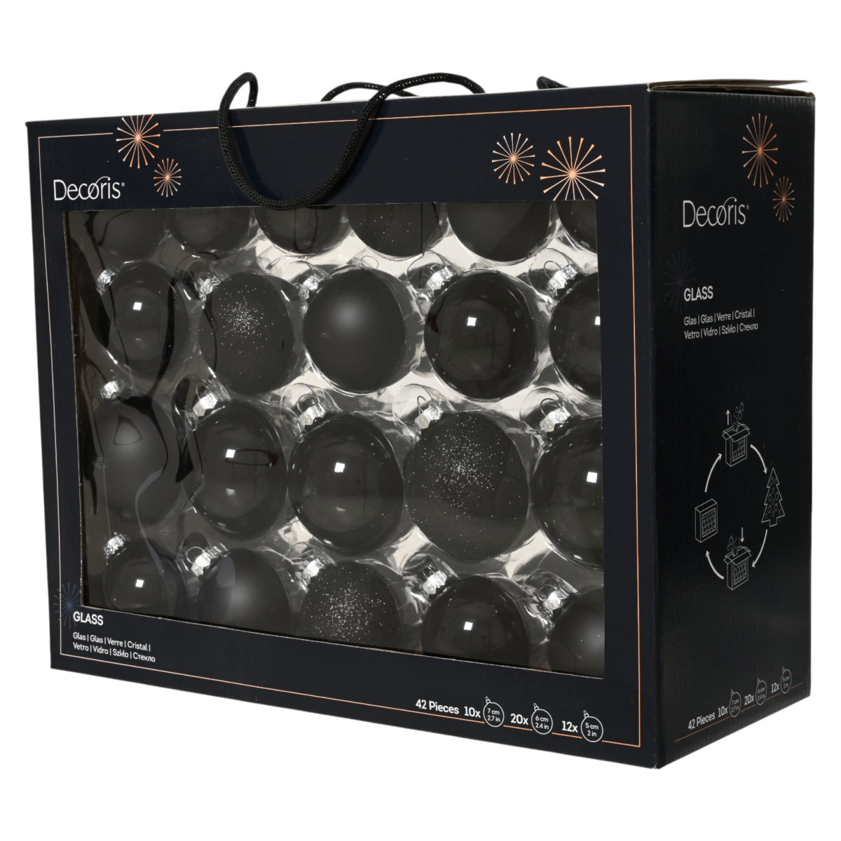 Ez a 42 darabos fekete üveggömb szett háromféle méretet tartalmaz, így változatos, harmonikus beltéri dekorációt hozhatsz létre karácsonyfádon vagy más ünnepi díszítésben. A matt, csillogó és fényes felületek kombinációja különleges vizuális hatást kelt, a színvilág pedig modern, letisztult stílust képvisel.