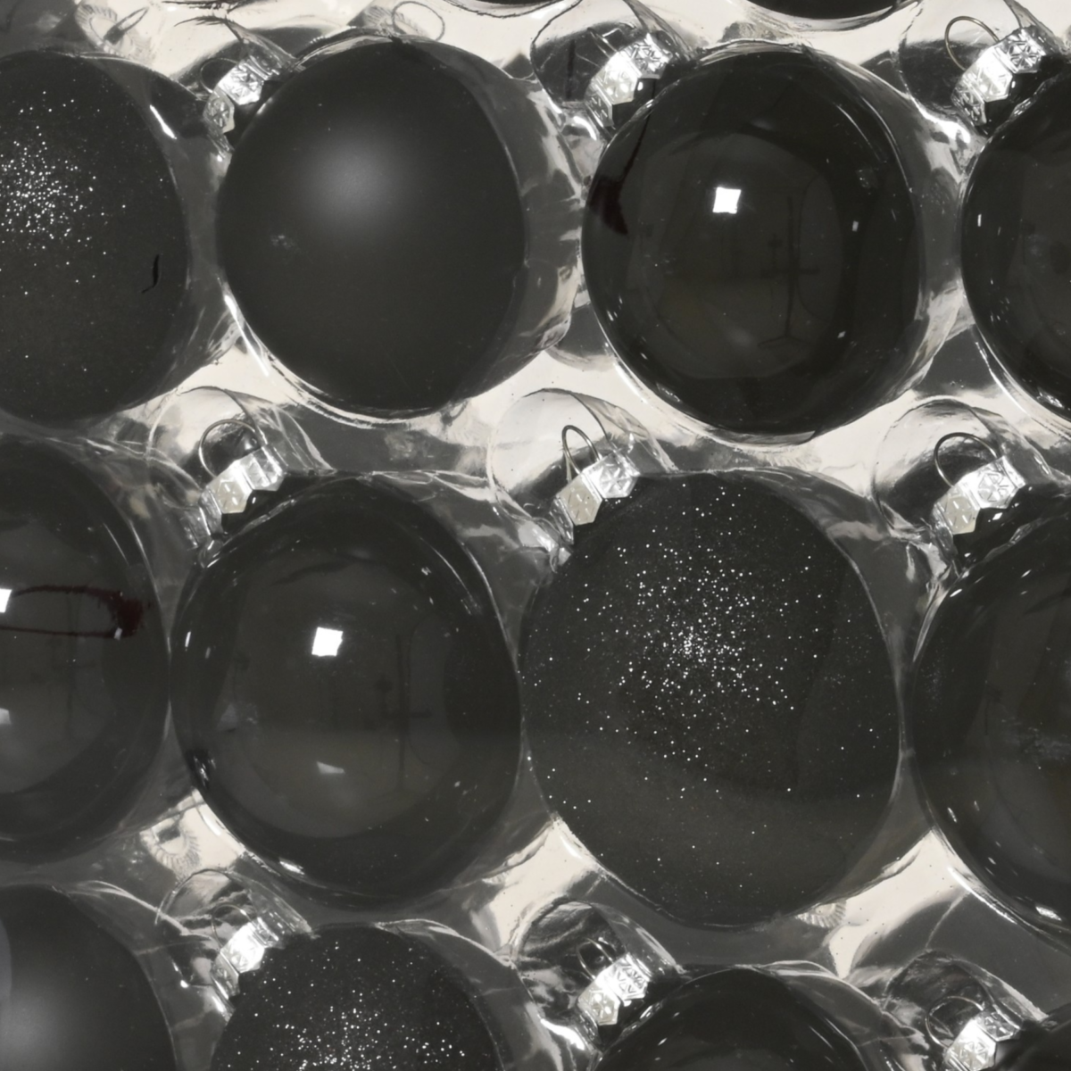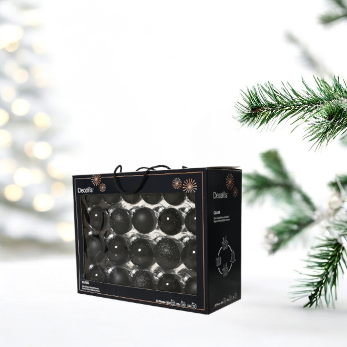 Fekete üveggömb szett 42 darabos – változatos méretű, stílusos díszek elegáns karácsonyfához