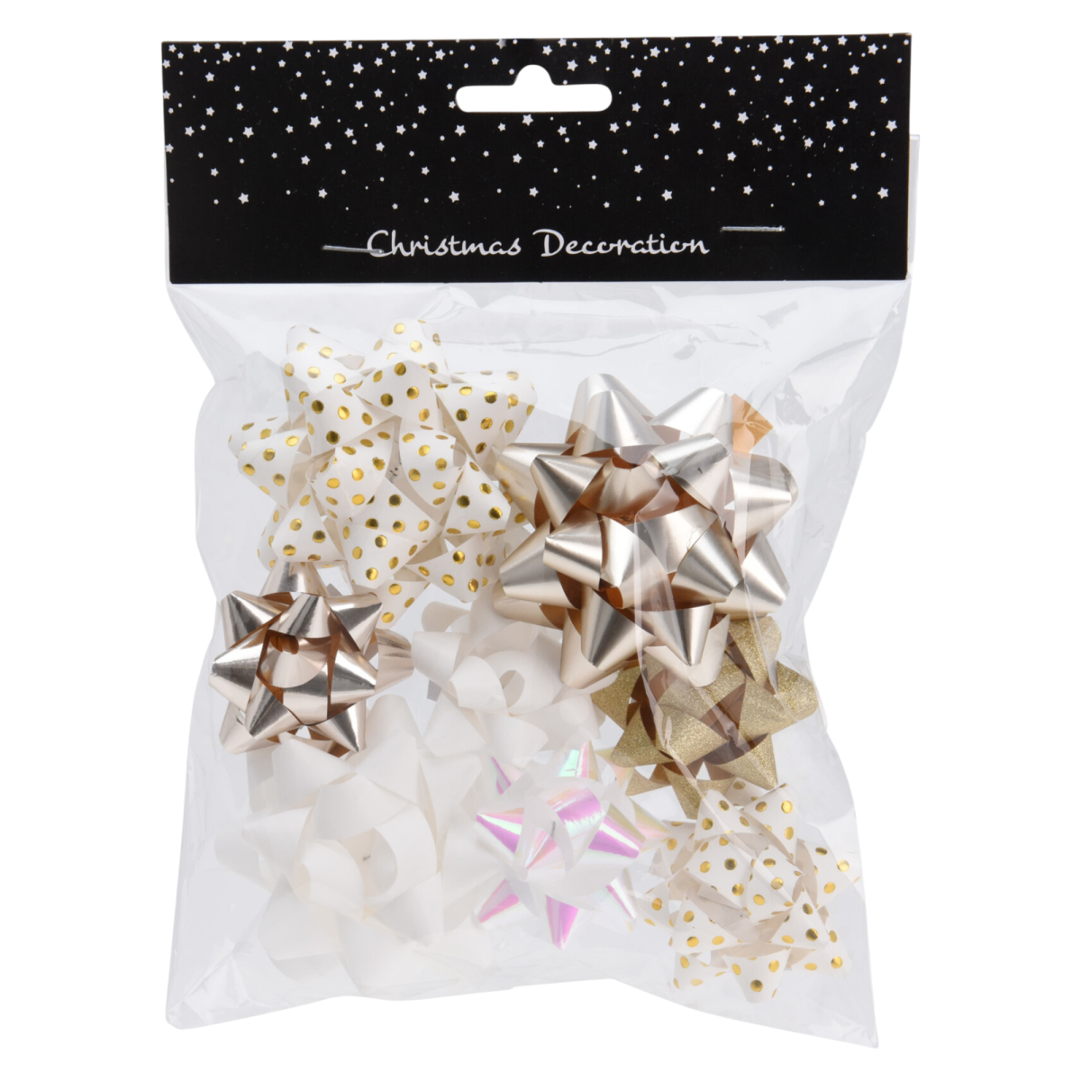 8 db-os fehér/arany színű masni szett különböző motívumokkal – dekoratív kiegészítő ajándékcsomagoláshoz