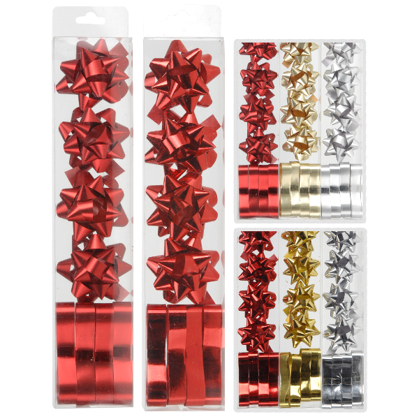 ajándék masni és szalag szett ajándékok csomagolásához és dekorálásához. A szett 4 db 5 cm-es masnit, illetve 4 db 2 méteres szalagot tartalmaz különböző színekben.